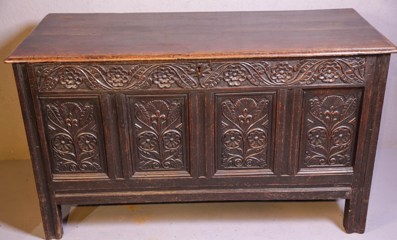 A superb 17th Century antique oak coffer. The carving being original is fantastic, the plank lid has its original wire hinges, and a candle box to the inside, the bottom boards are original and good. A fine box in excellent condition