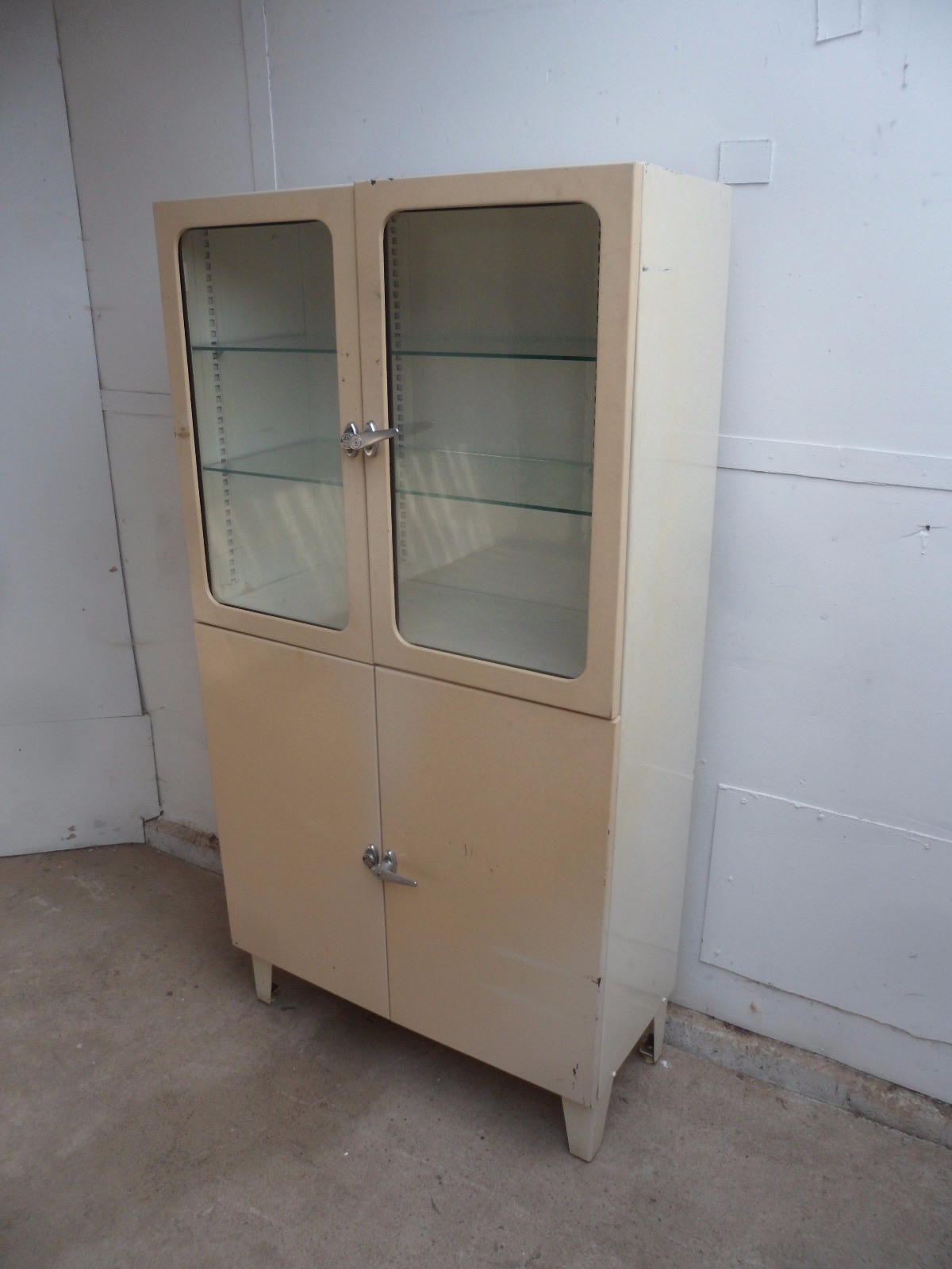 Rare Originally Painted Glazed 4 Door Metal Medicine Display Cabinet