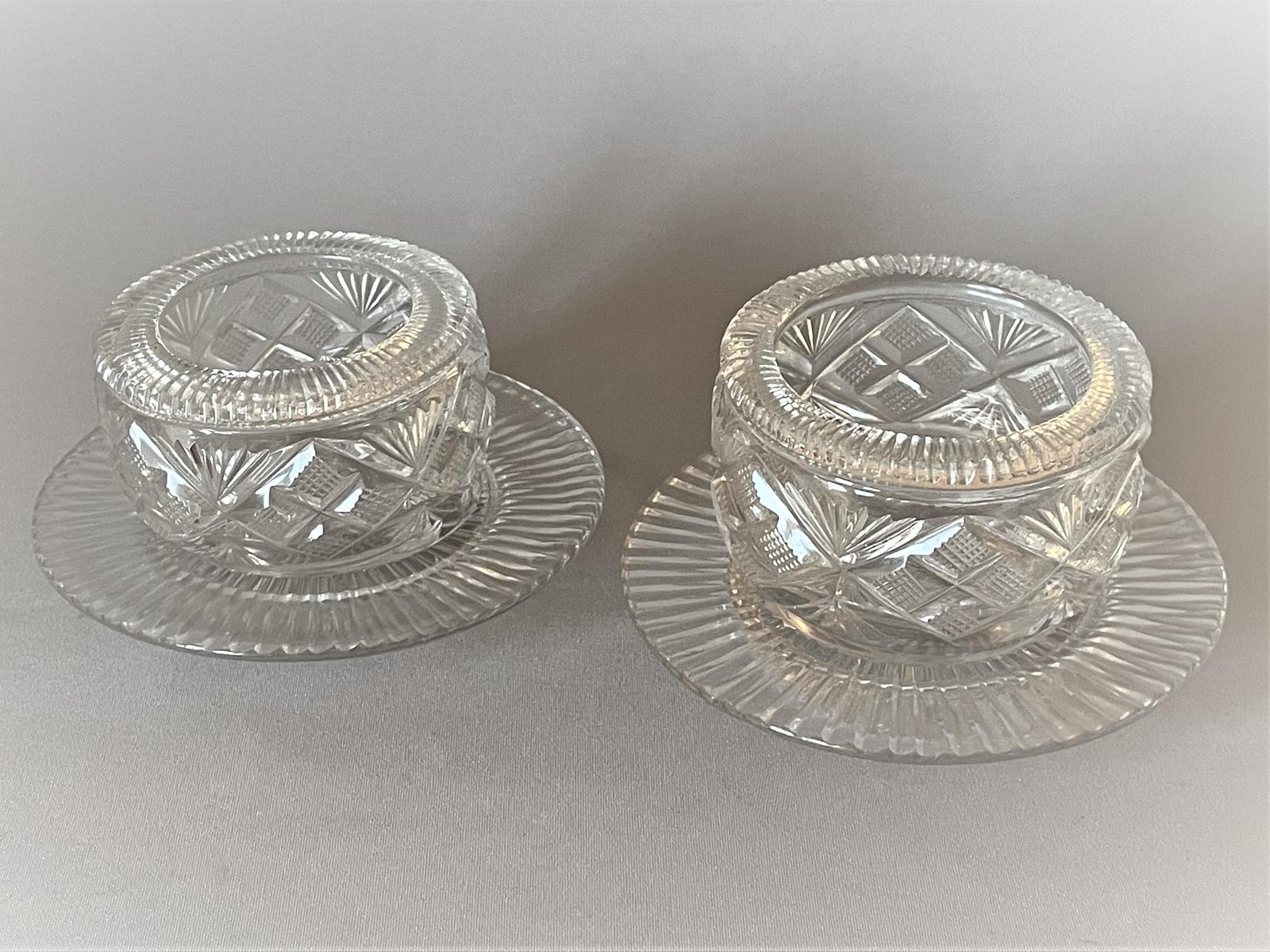 Rare Pair of Georgian Cut Glass Condiment Tubs & Saucers