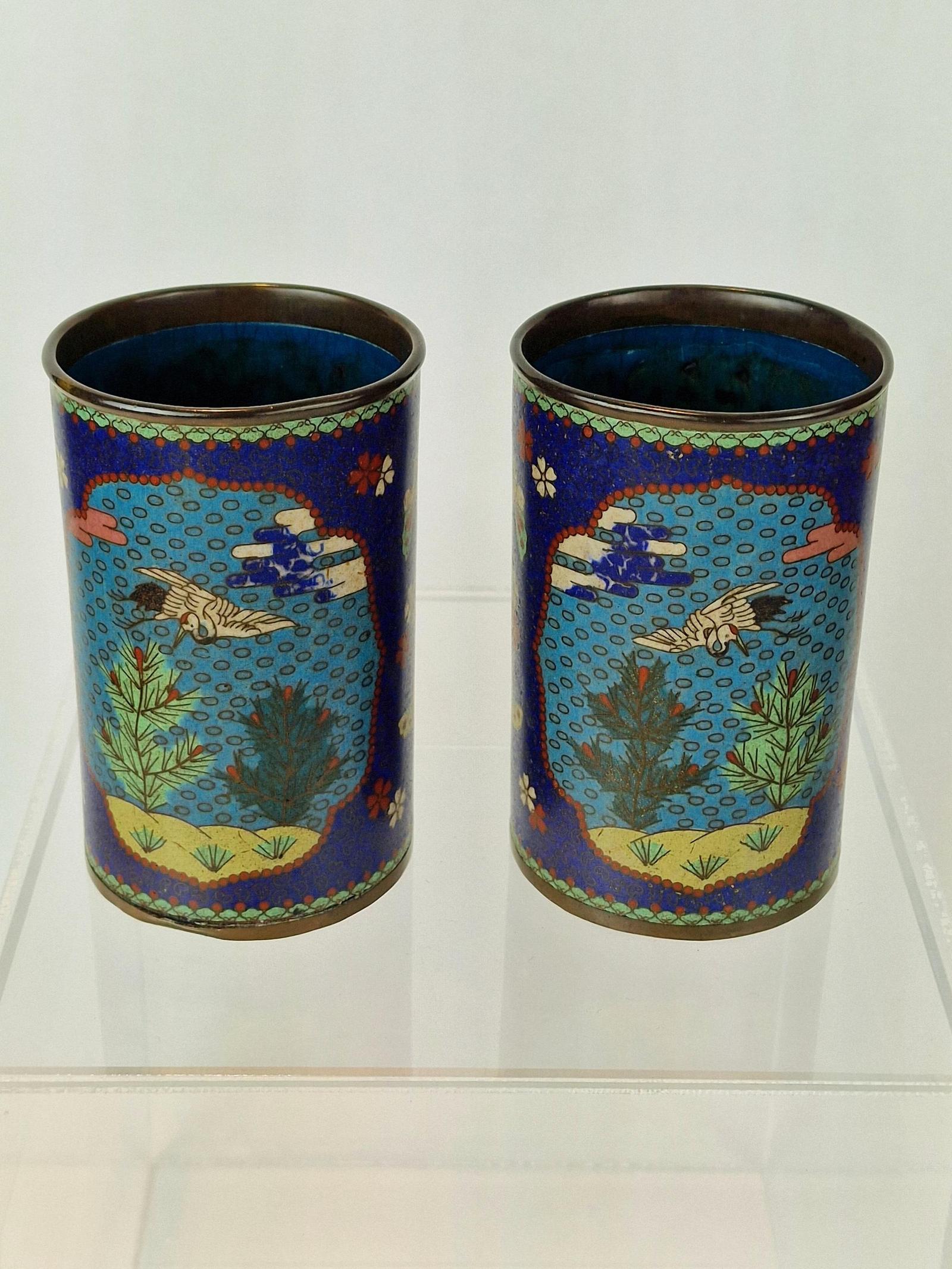 Rare Pair of Japanese Cloisonne on Bronze Brush Pots - Meiji Period