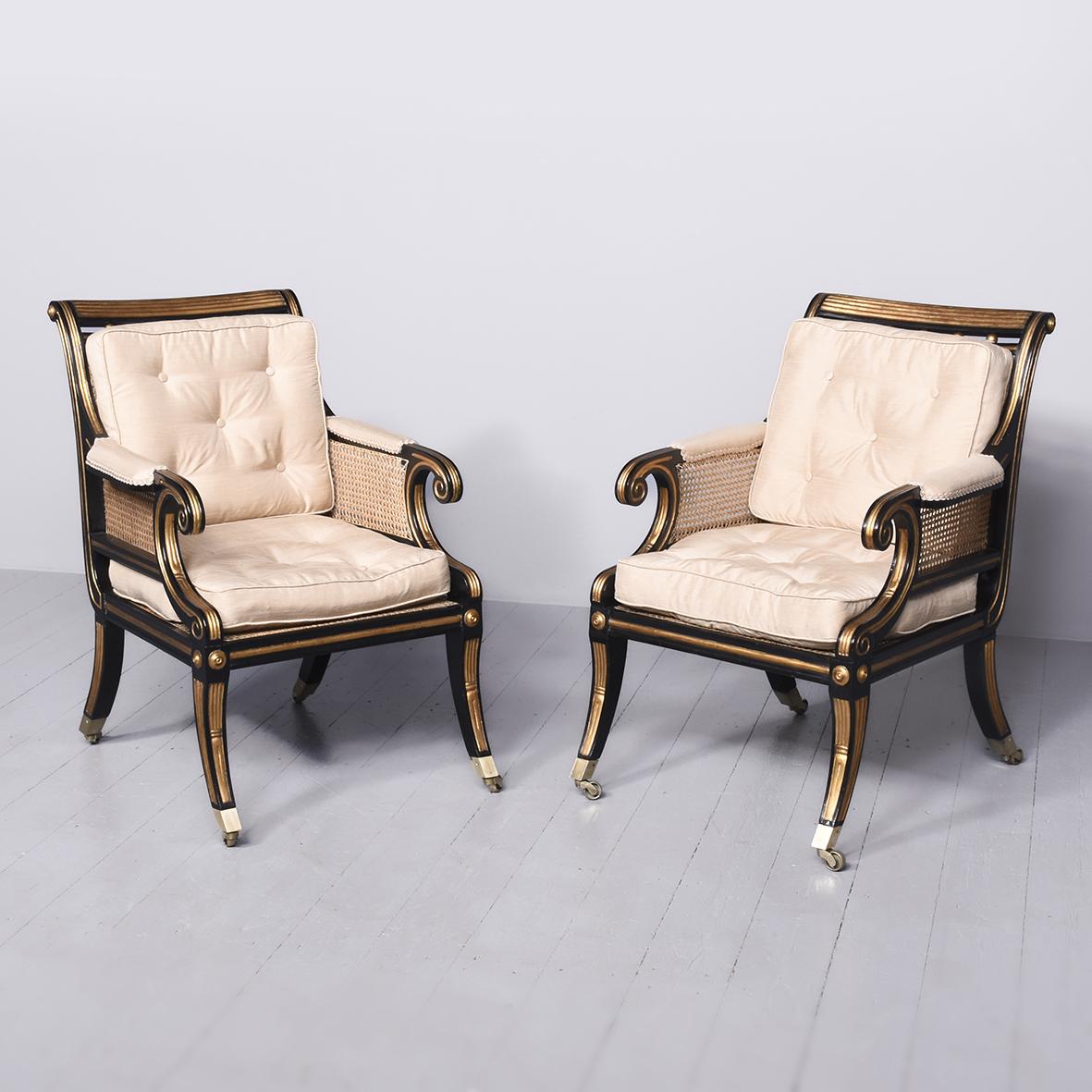 Rare Pair of Large Regency Cane Upholstered Gilt and Ebonized Bergère Chairs