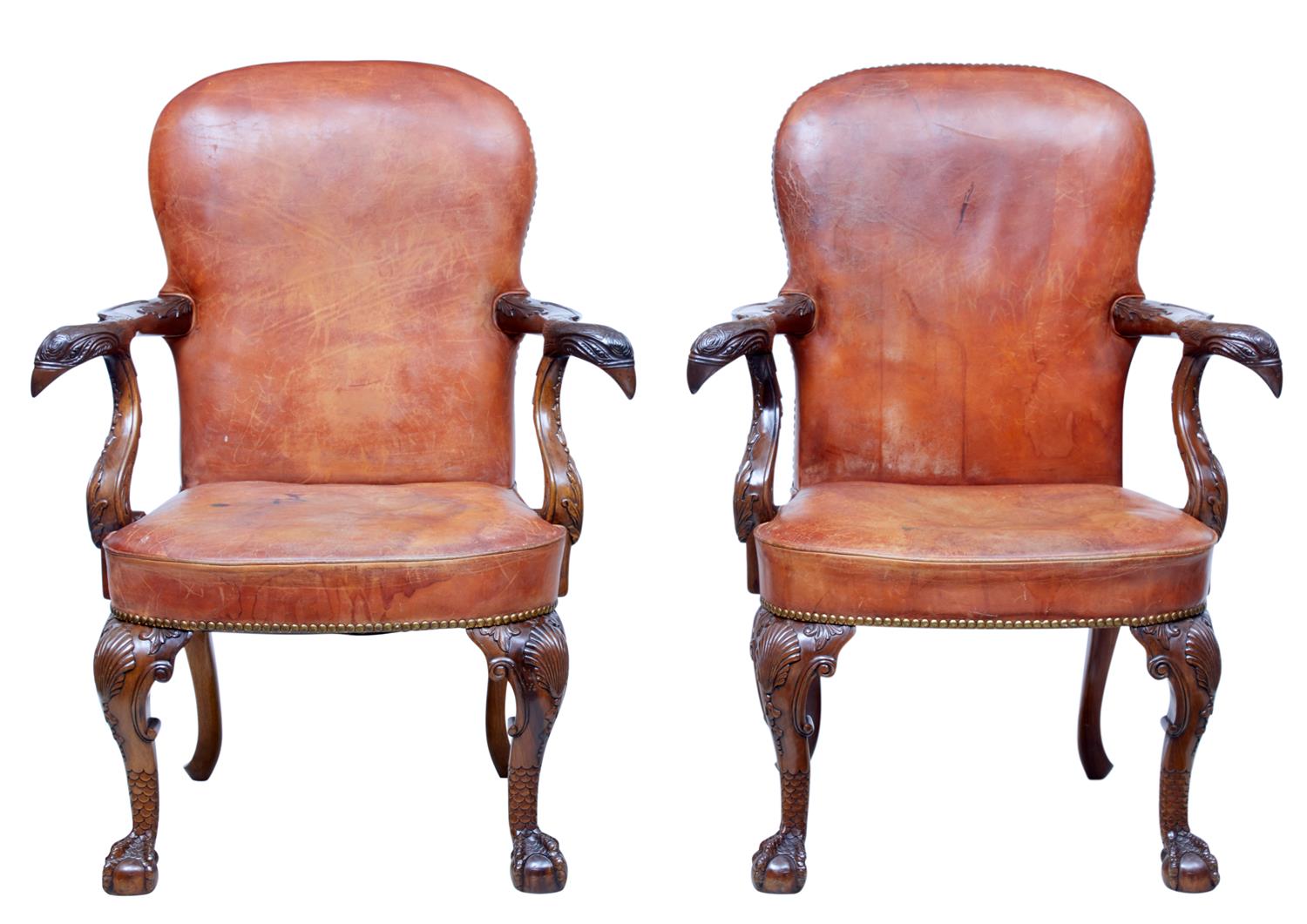 Rare Pair of Mid 20th Century Carved Mahogany Armchairs