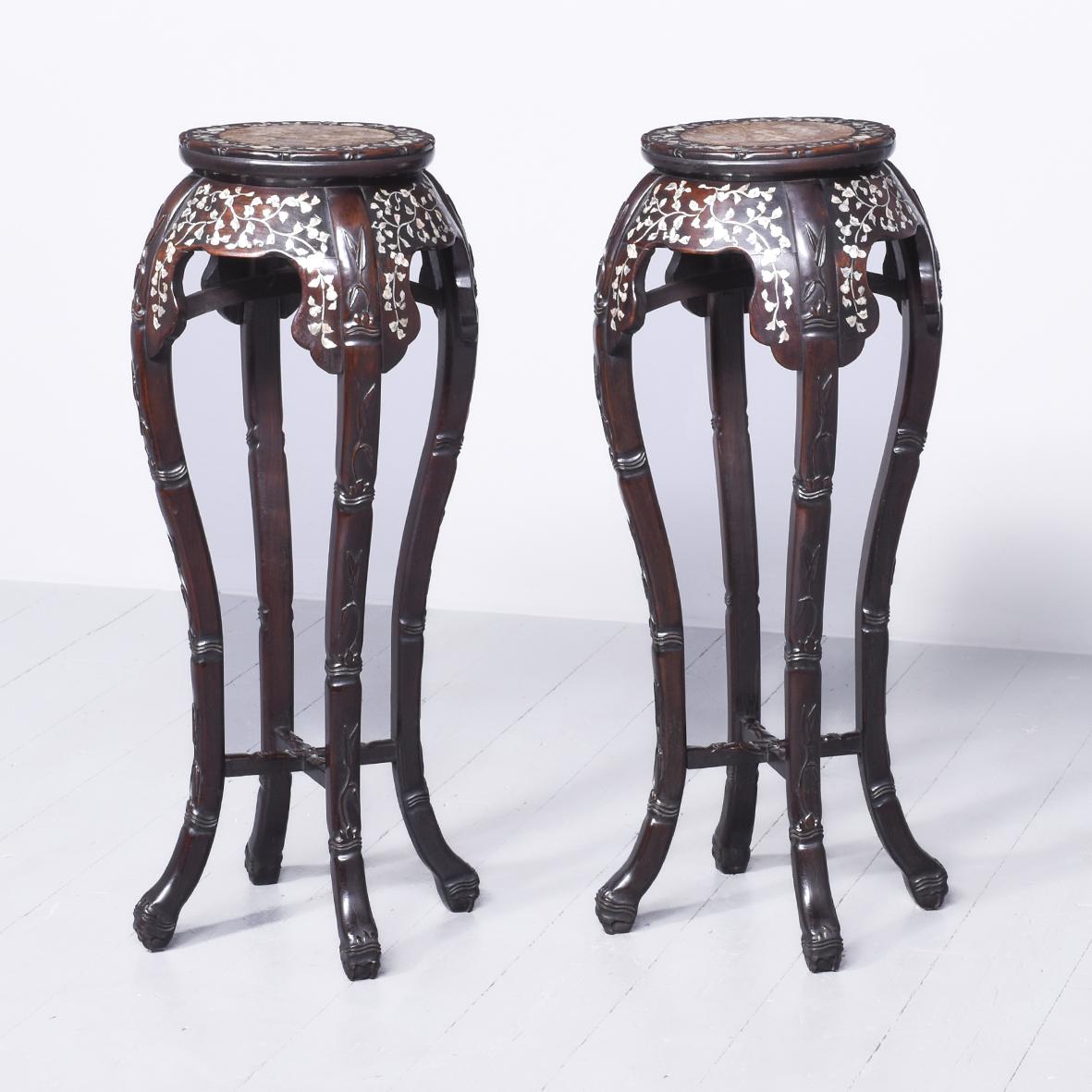 Rare Pair of Tall Chinese Mother of Pearl Inlaid Hongmu Plant Stands