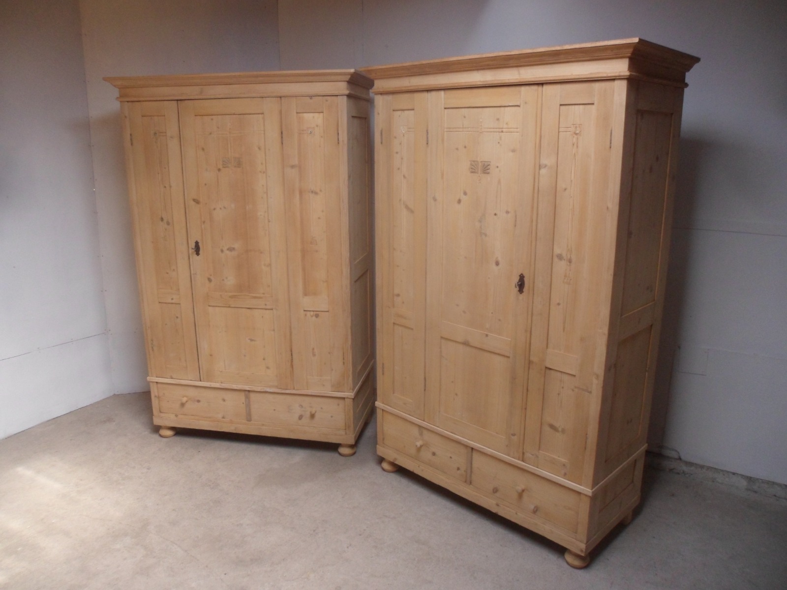 Rare Pair of Triple Carved Antique Pine Knockdown Wardrobes to wax / paint