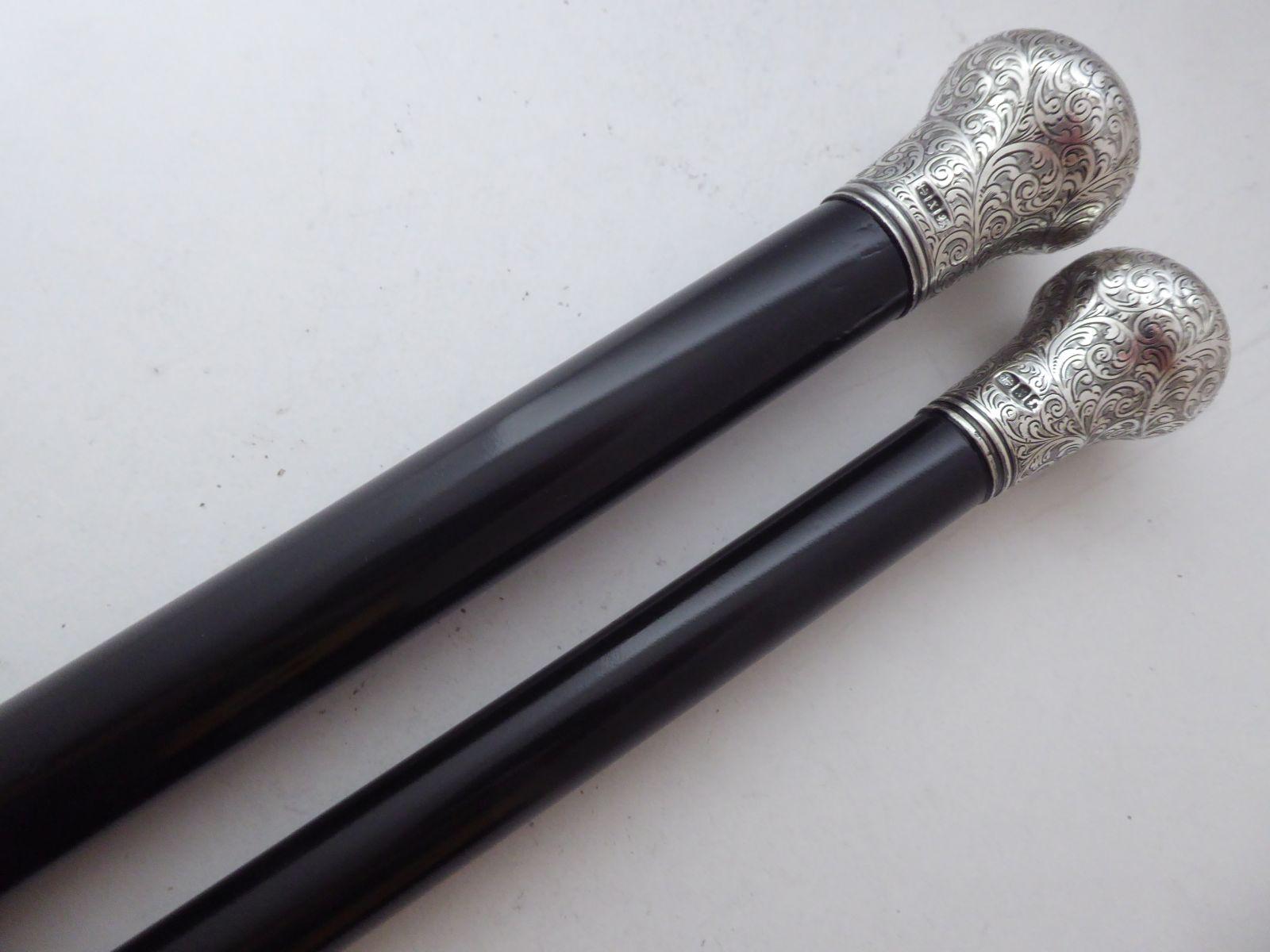 Rare Pair of Walking Stick Cane 1897 Hallmarked Silver Pommel Ebony Shaft His & Her