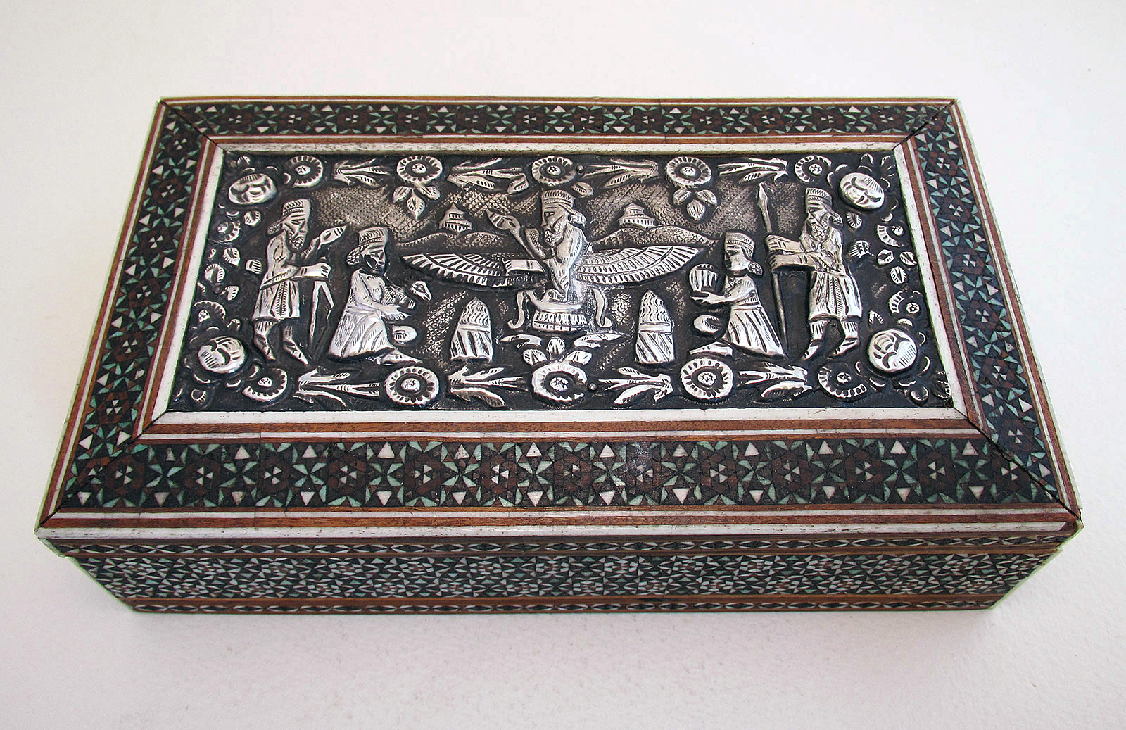 Rare Parsi Silver Mounted Zoroastrian Faravahar, Indian Bombay Sadeli Antique Trinket/Cigarette Box C.1890 (1 of 13)