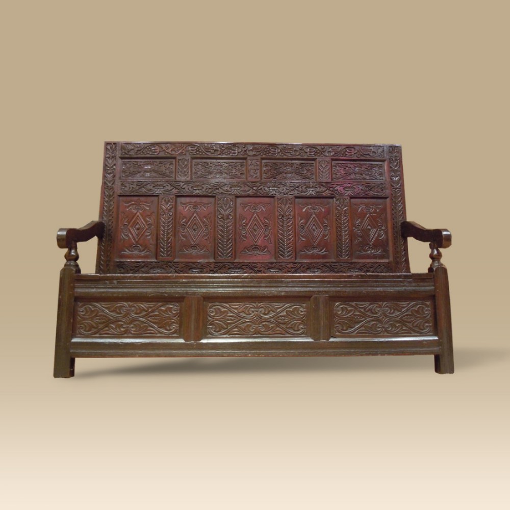 Rare Period Oak Settle Profusely Carved & Dated 1674 with the Initials 'As'