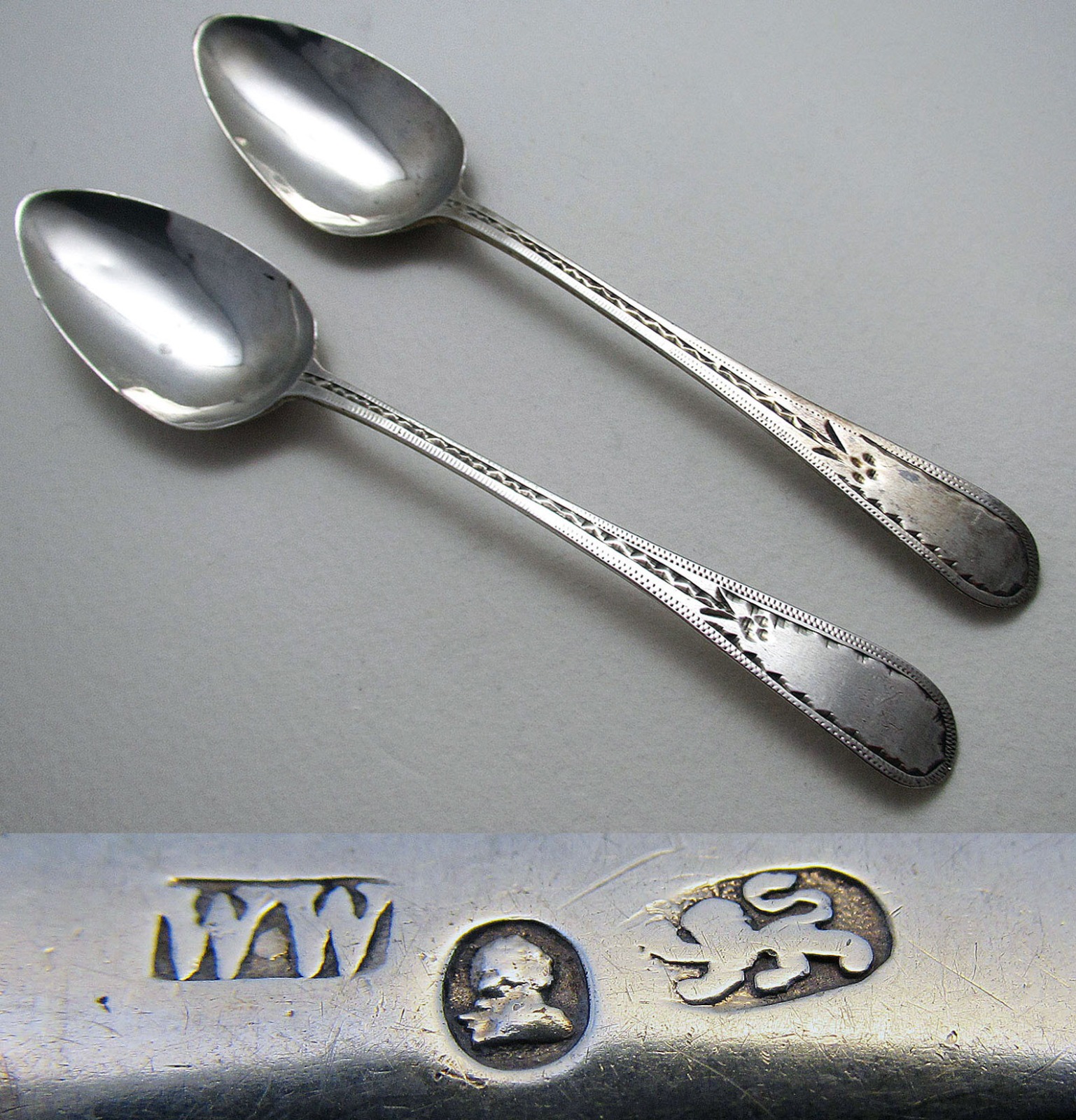 Rare Provincial C1790 Georgian-George III Solid Sterling Silver Pair Tea Spoons, William Welch Plymouth Dock, 18Th-Century Exeter Hallmarked