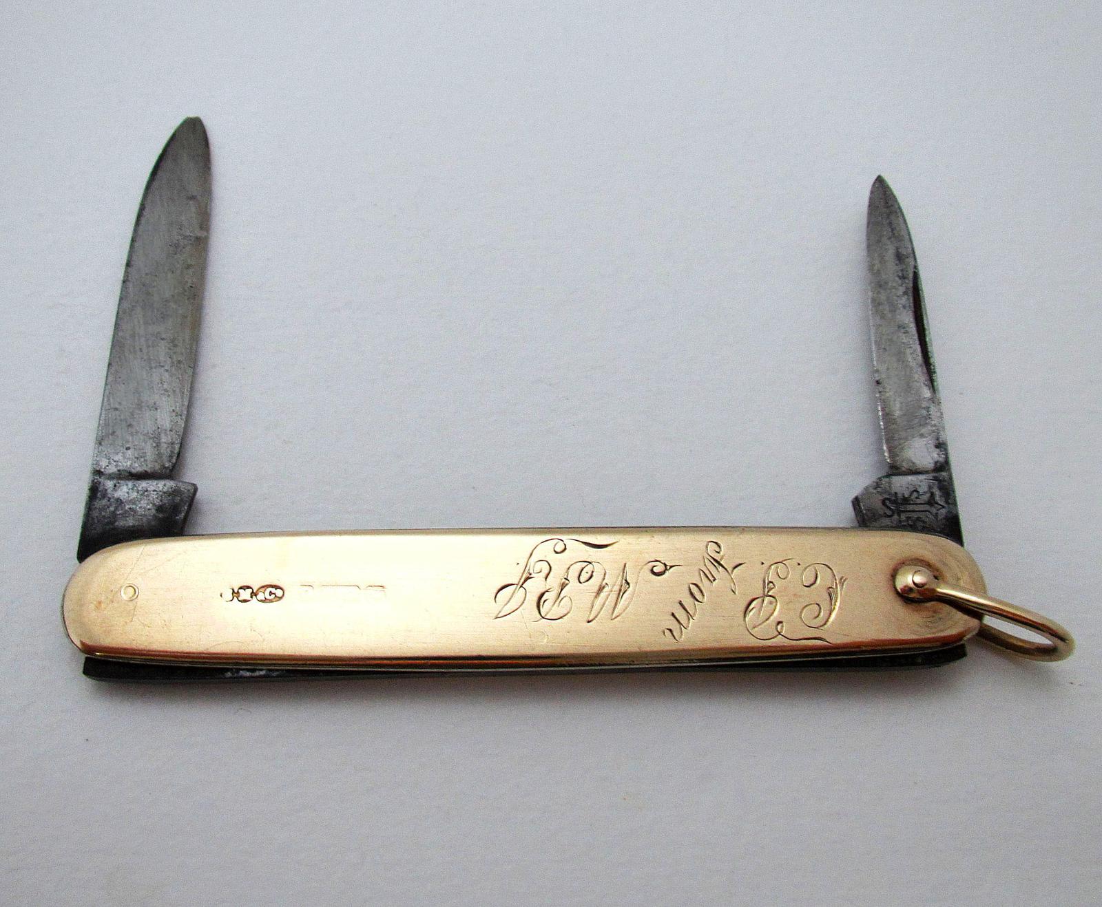 Rare Sampson Mordan 9ct Gold Antique Double Folding Pocket Fruit Knife, Chester 1906