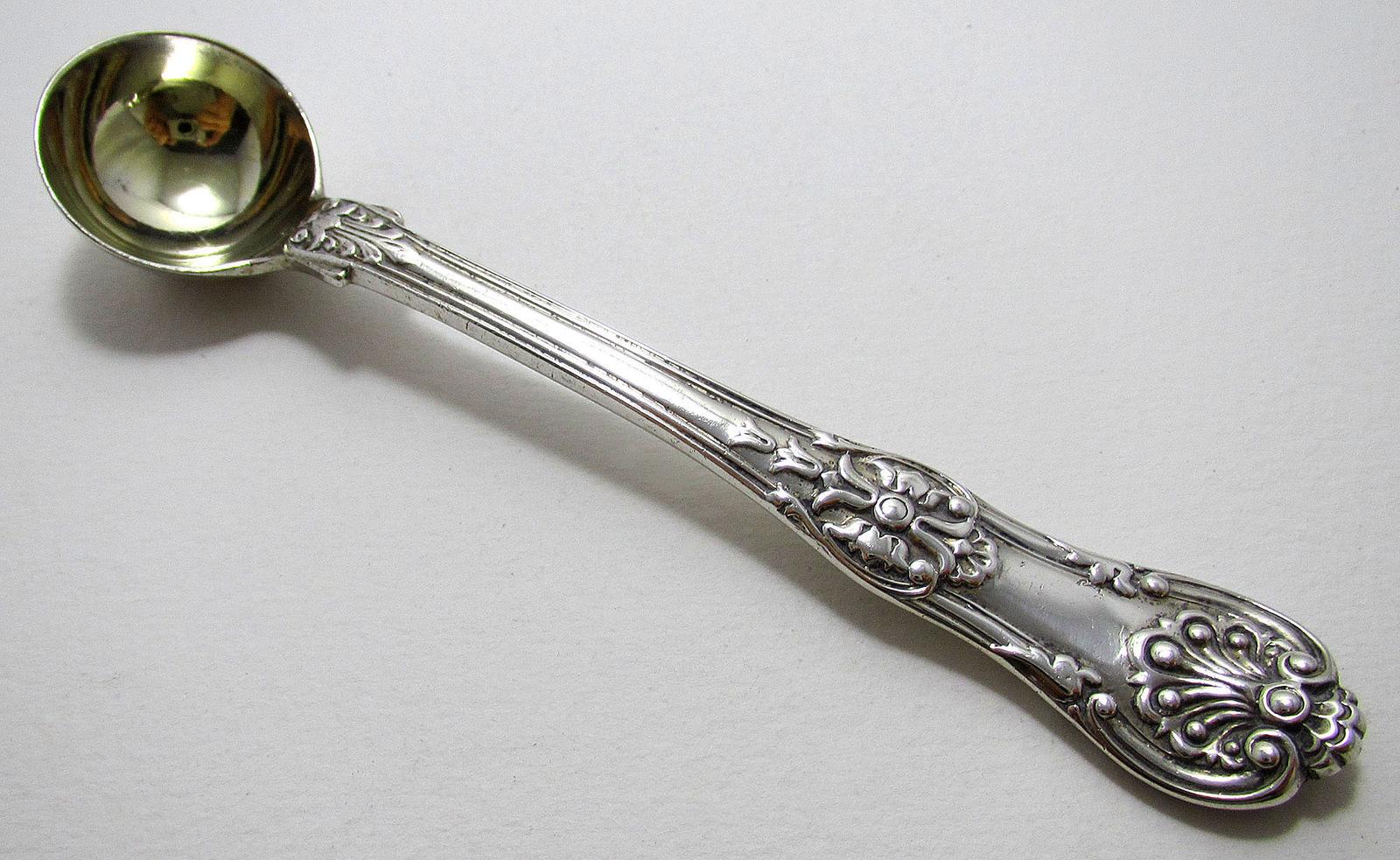 Rare Scroll Rosette Queens Pattern Condiment/Salt Spoon, Antique Victorian Sterling Silver, William Eaton 1838