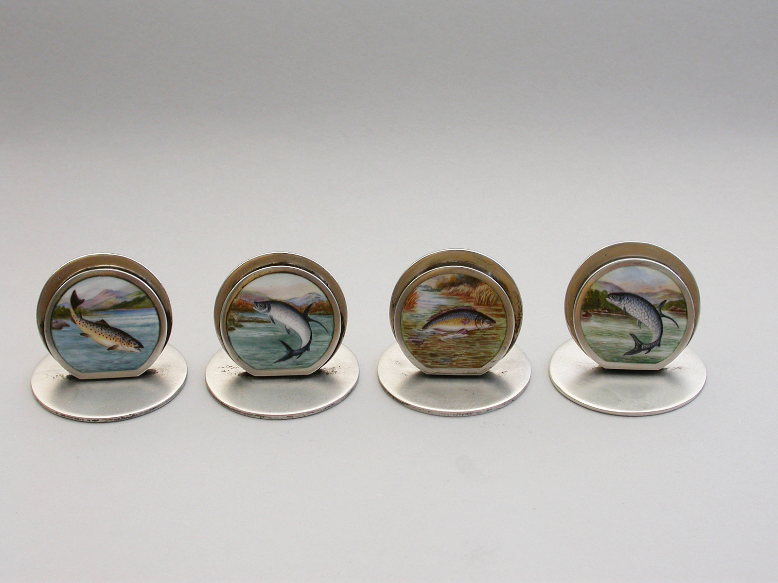Rare Set of 4 Edwardian Silver & Enamel 'Fish' Menu Holders