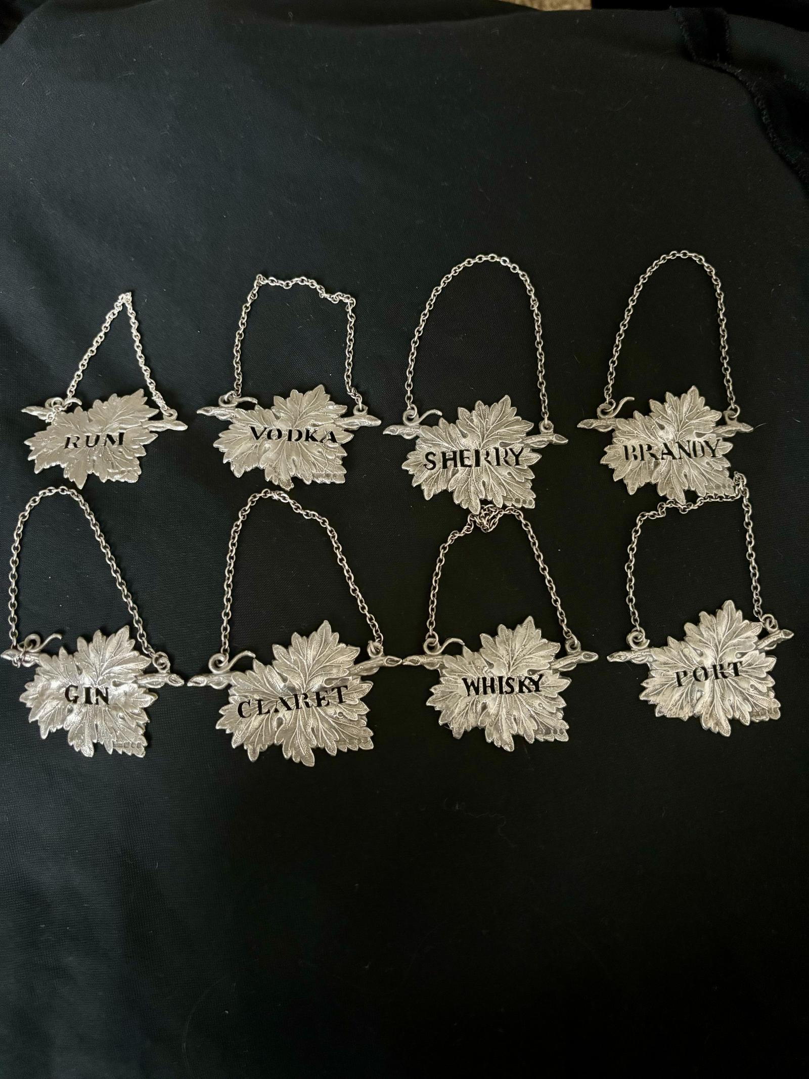 Rare Set of 8 Sterling Silver Decanter Labels with Vine Leaf Decoration (1 of 16)