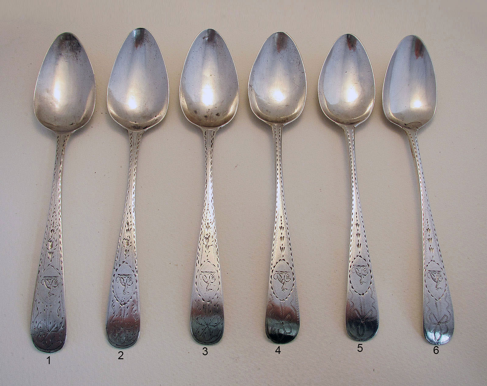 Rare Set of Antique Irish George III Solid Sterling Silver Bright-Cut Dessert Spoons, Michael Keating, John Craig. 18th-19th Century (1 of 1)