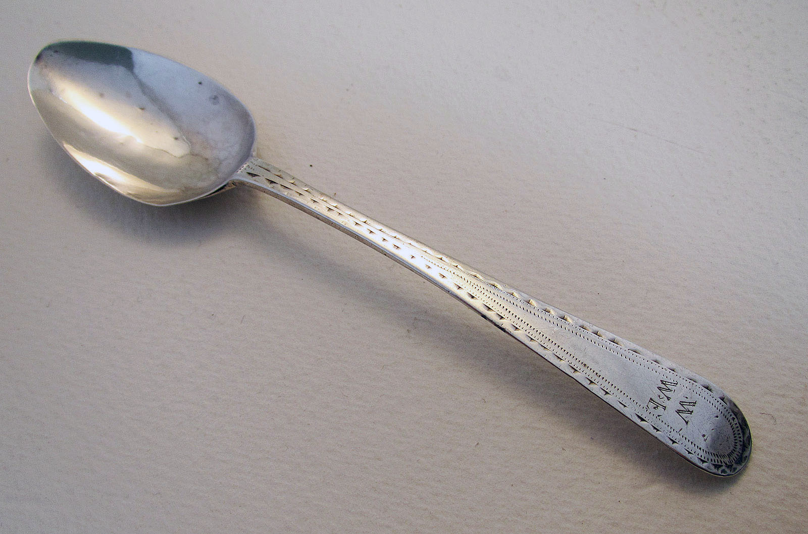 Rare Shrewsbury 18th Century Georgian English Provincial Antique Solid Sterling Silver Tea Spoon. Richard Evans. Bright-Cut Pattern 1789