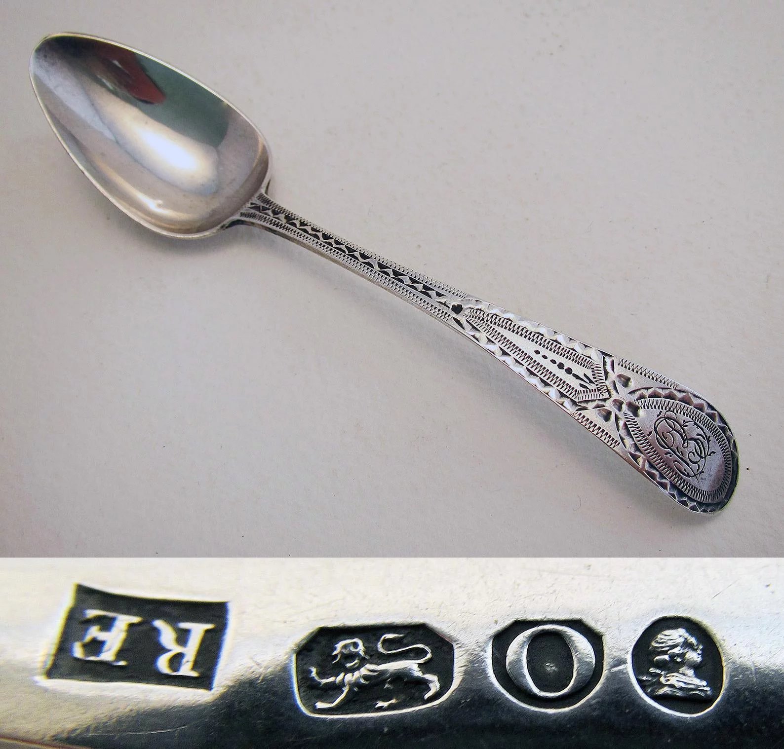 Rare Shrewsbury 18th Century Georgian English Provincial Hallmarked Antique Solid Sterling Silver Tea Spoon, Bright-Cut Pattern 1789