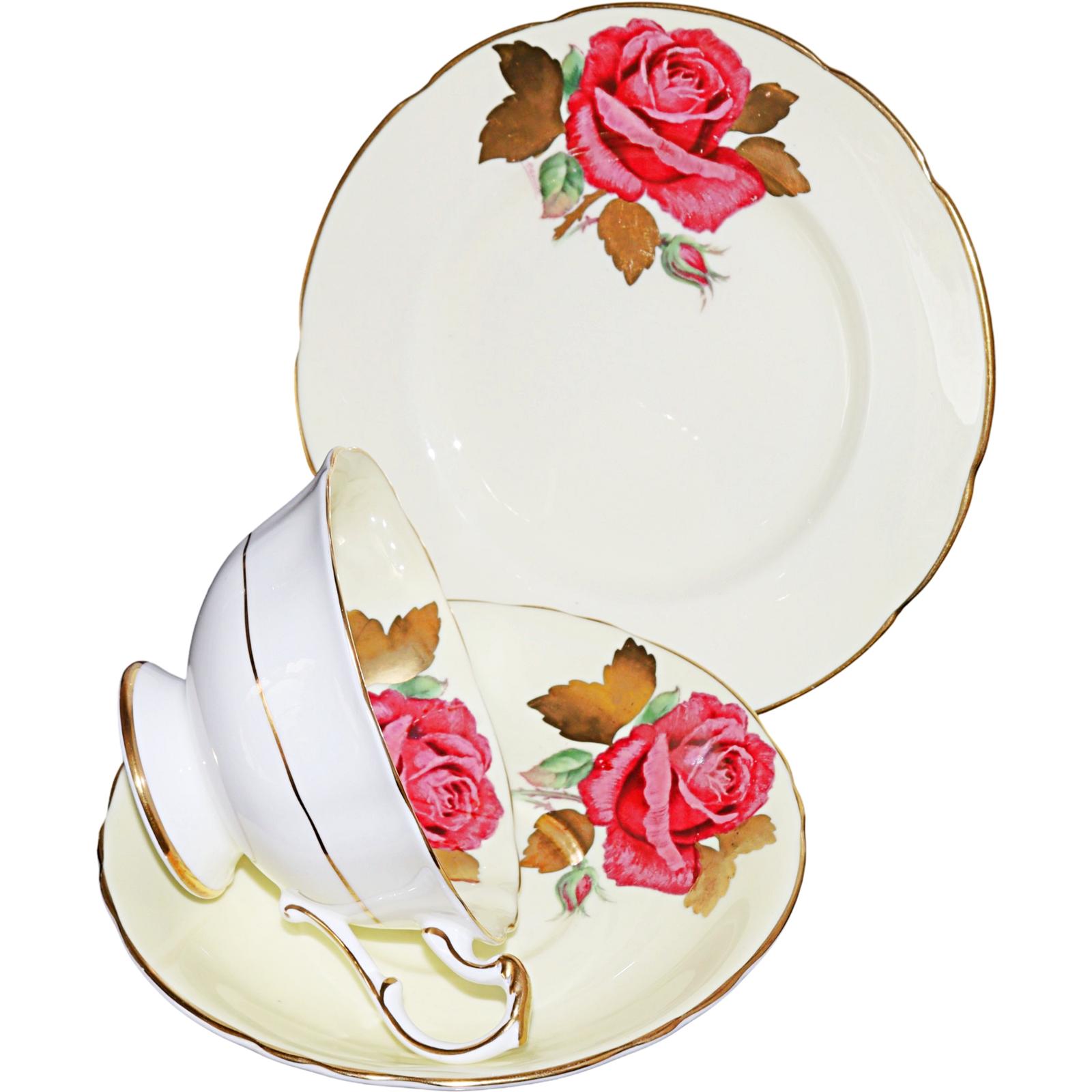 Rare vintage Paragon bone china teacup, saucer and plate, signed Reg Johnson, pale yellow ground, decorated with red rambling roses, gilt leaves, signed on the tea plate, manufacturers mark to base, circa 1960
