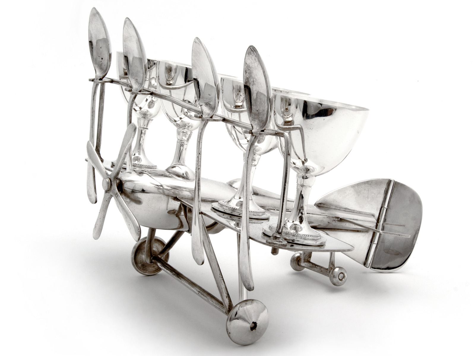 Rare Silver Plate Bi-Plane Holding Four Egg Cups & Four Teaspoons (1 of 1)
