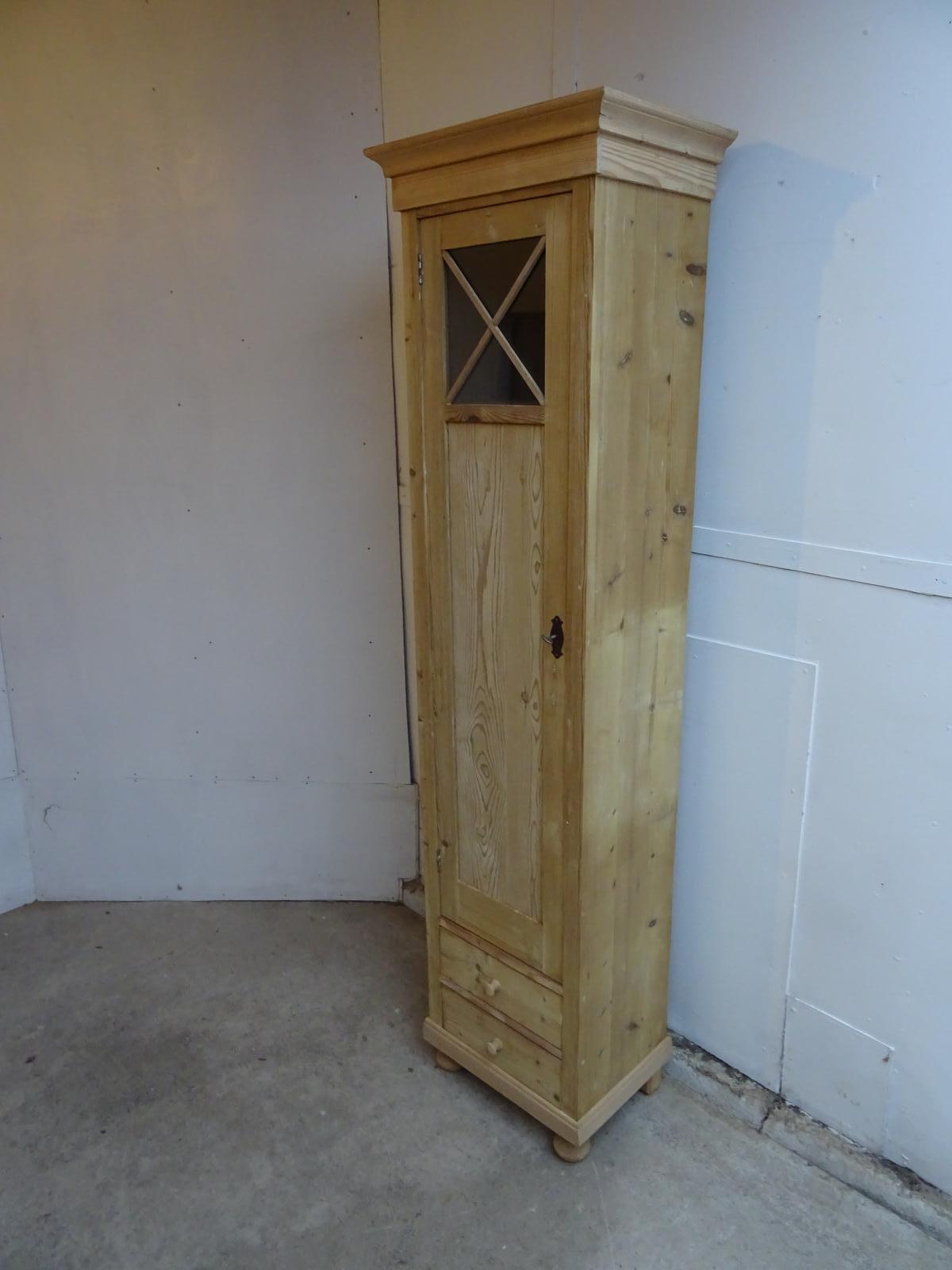 Rare Slim Antique Pine 1 Door 2 Drawer Glazed Storage Cupboard to wax / paint