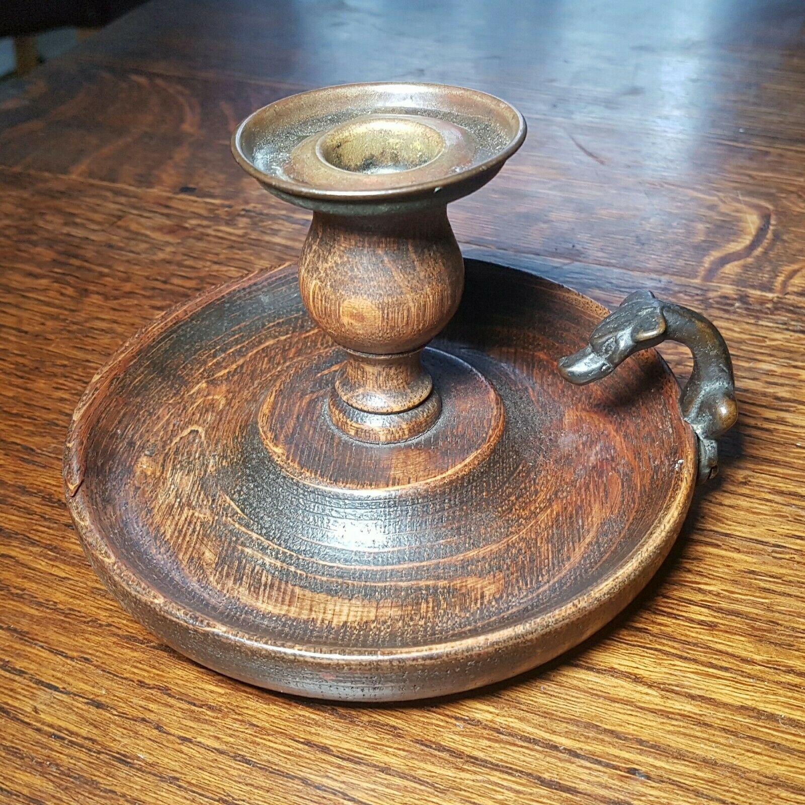 Rare Stunning 18th Century Oak & Bronze Hunting Dog Handle Chamberstick c.1770