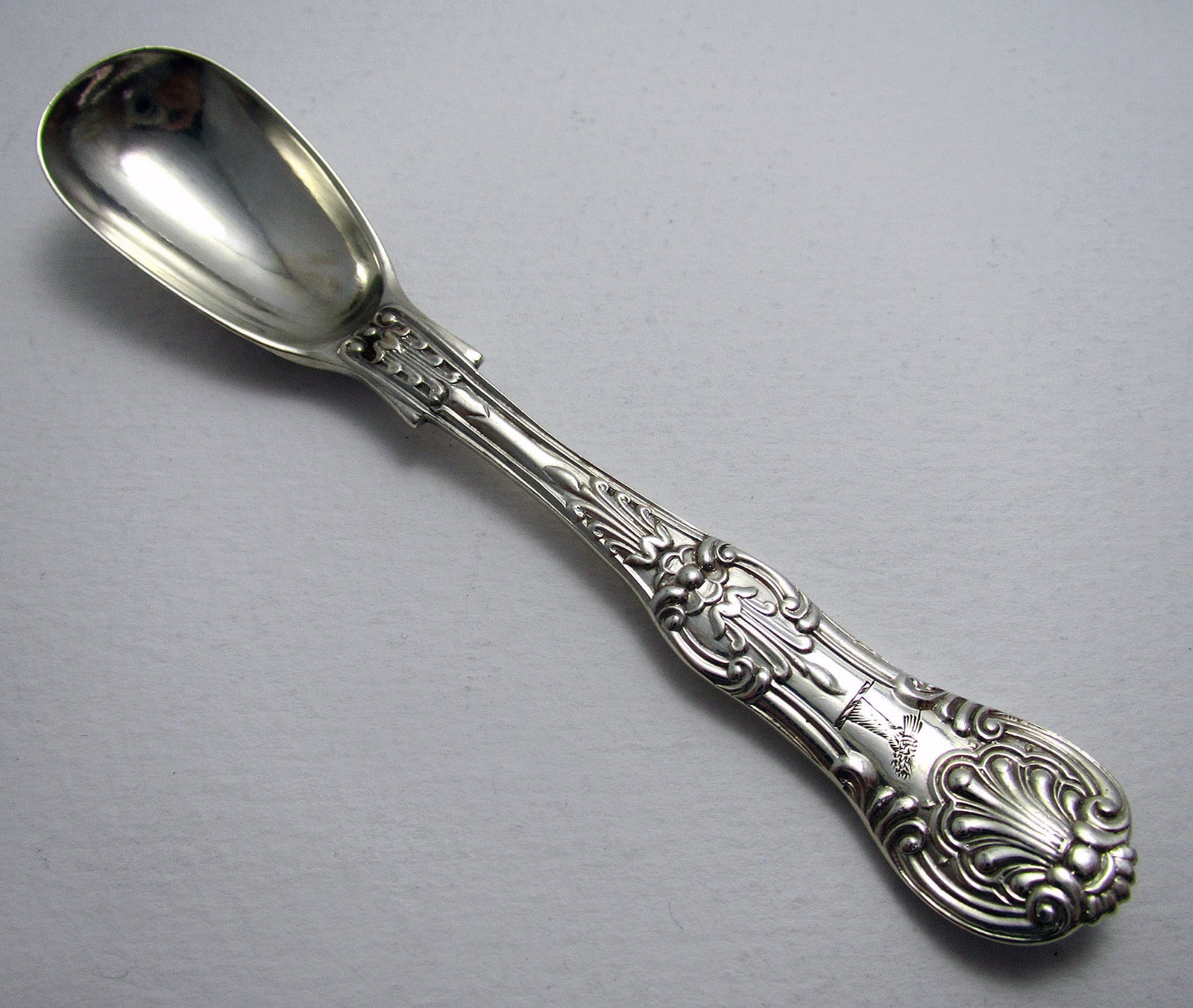 Rare Victorian 1843 Queen's Honeysuckle Pattern Solid Sterling Silver English Antique Salt / Condiment / Mustard Pot Spoon by Chawner
