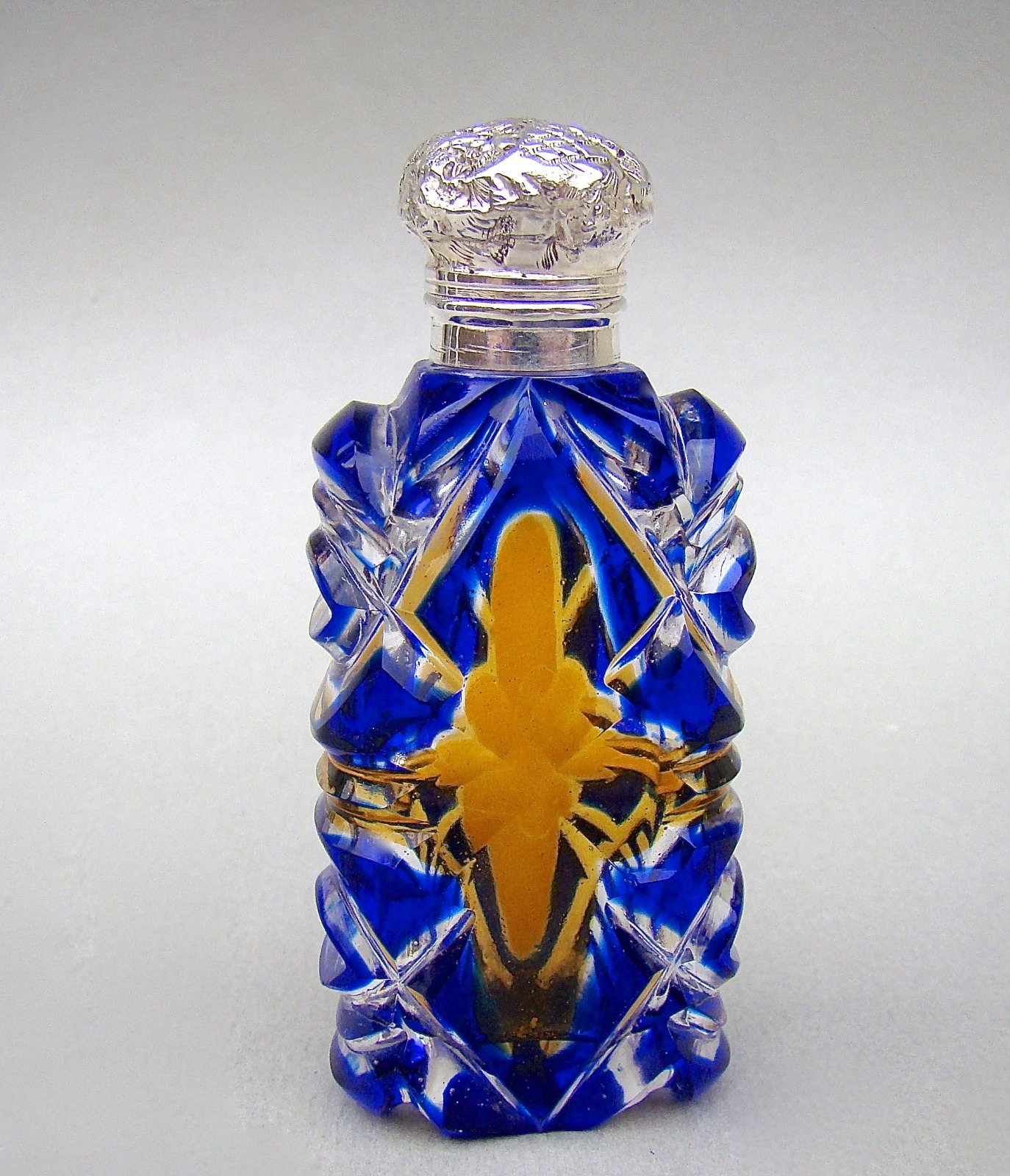 Rare Victorian Silver Blue & Amber Bohemian Glass Scent Bottle c.1890