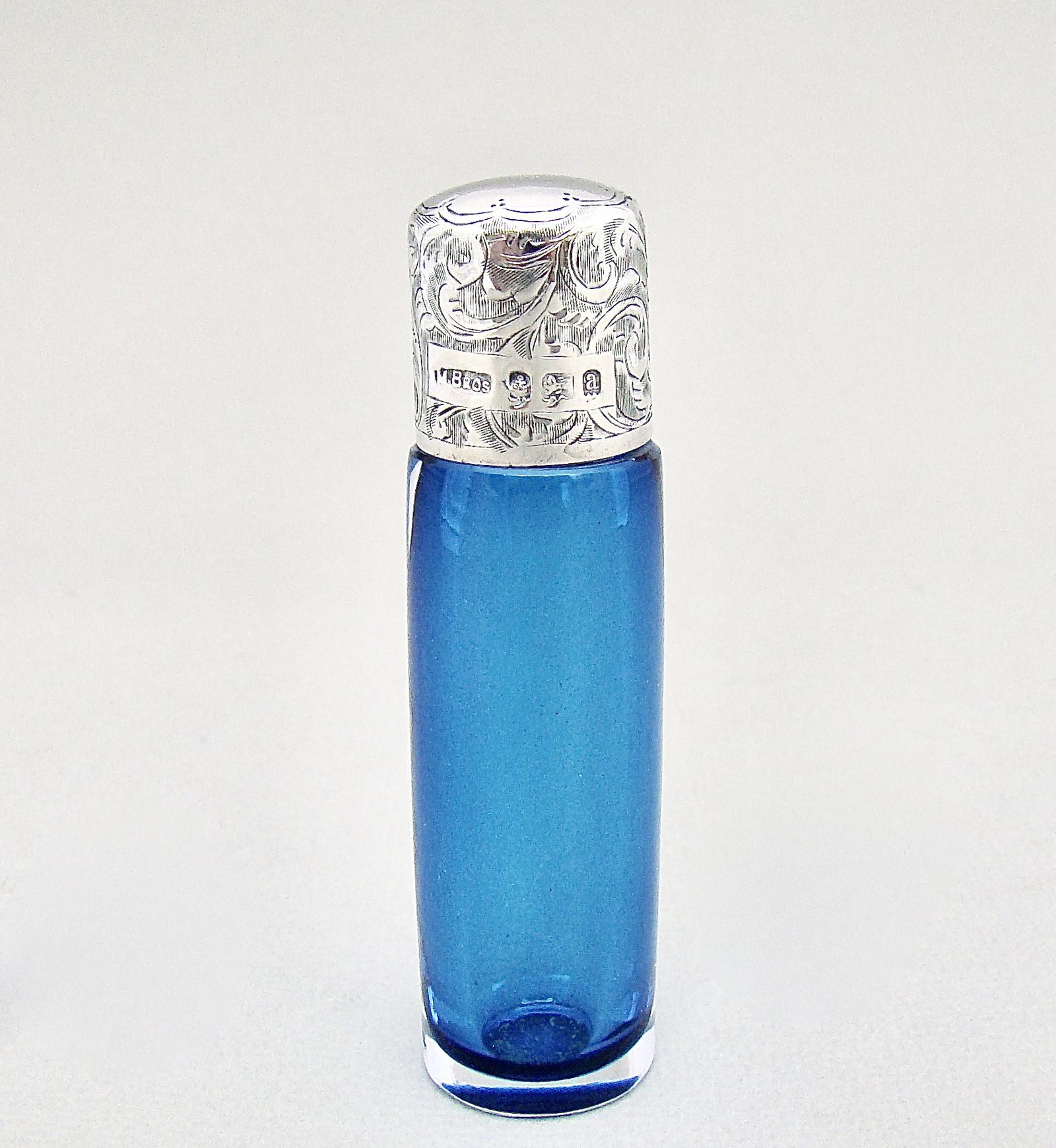 Rare Victorian Silver & Turquoise Glass Scent Bottle by The Mousley Brothers, Birmingham 1900