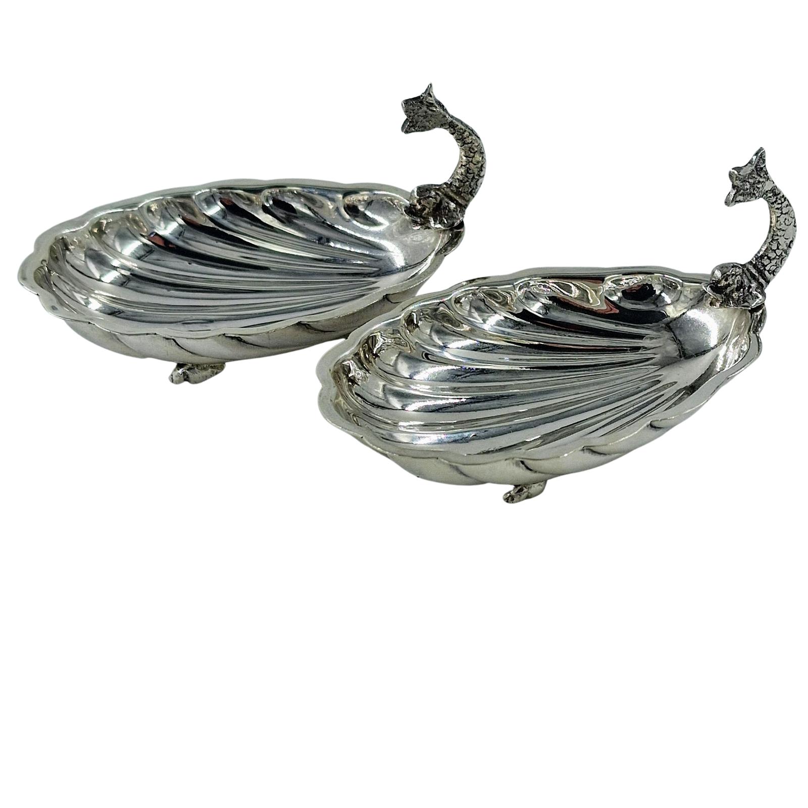 Rare Vintage Solid Silver Pair Oyster Dish with Dolphin Handles