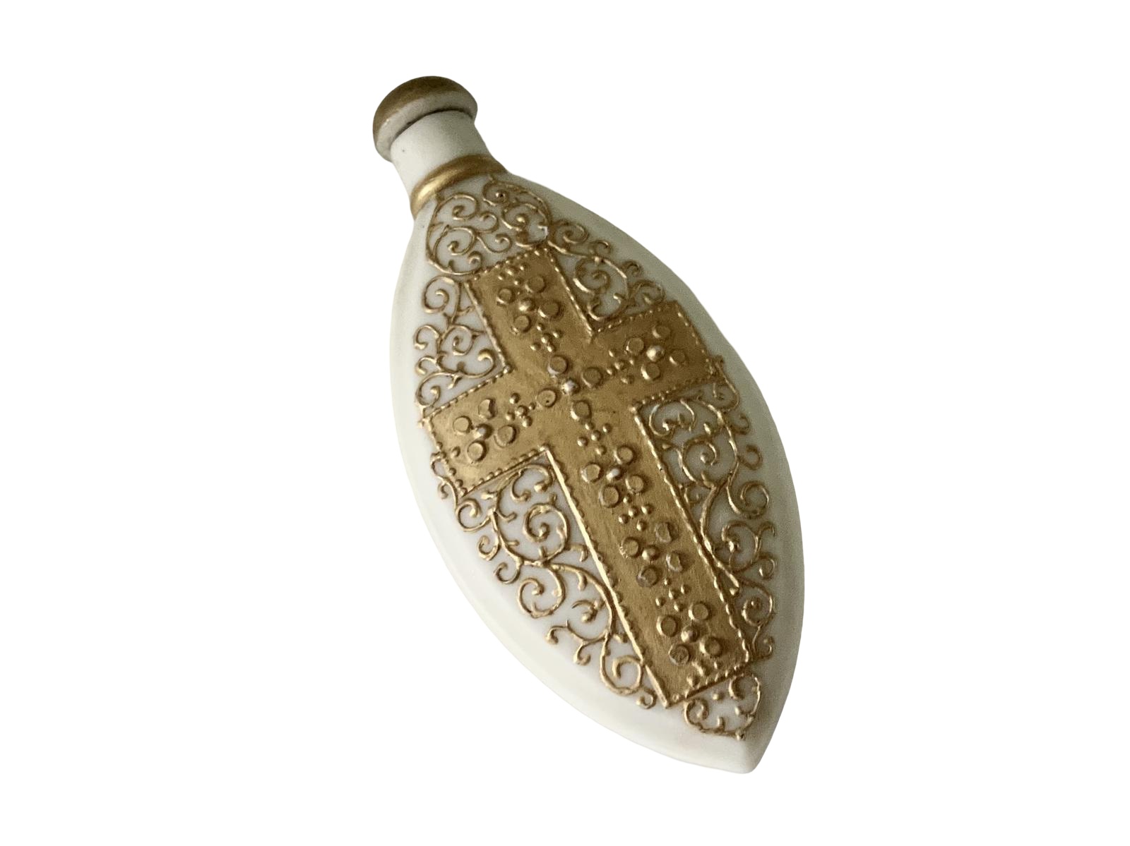 A rare late Victorian Parian ware scent bottle, shield shaped, crucifix decoration to the front embellished with gold and a beautiful butterfly to the reverse again gilded. Original stopper with cork. Please see photographs for condition.