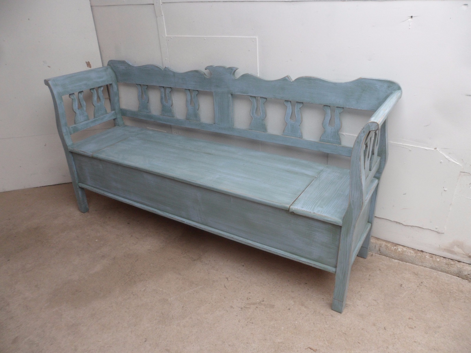 Really Pretty Pine Painted Blue / Green Shabby Chic Box Settle / Bench c.1920