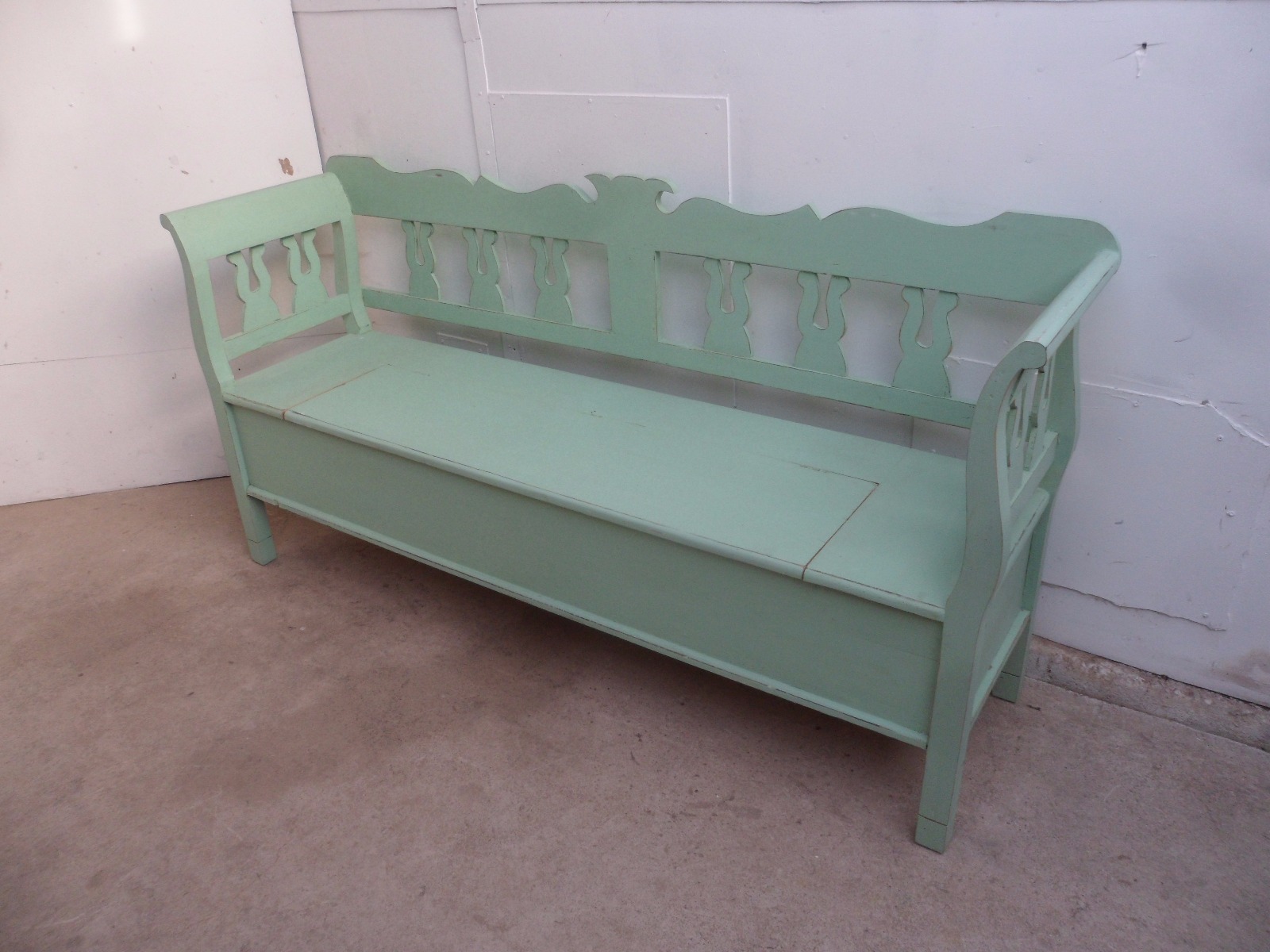 Really Pretty Pine Painted Light Green Shabby Chic Box Settle Bench c.1920