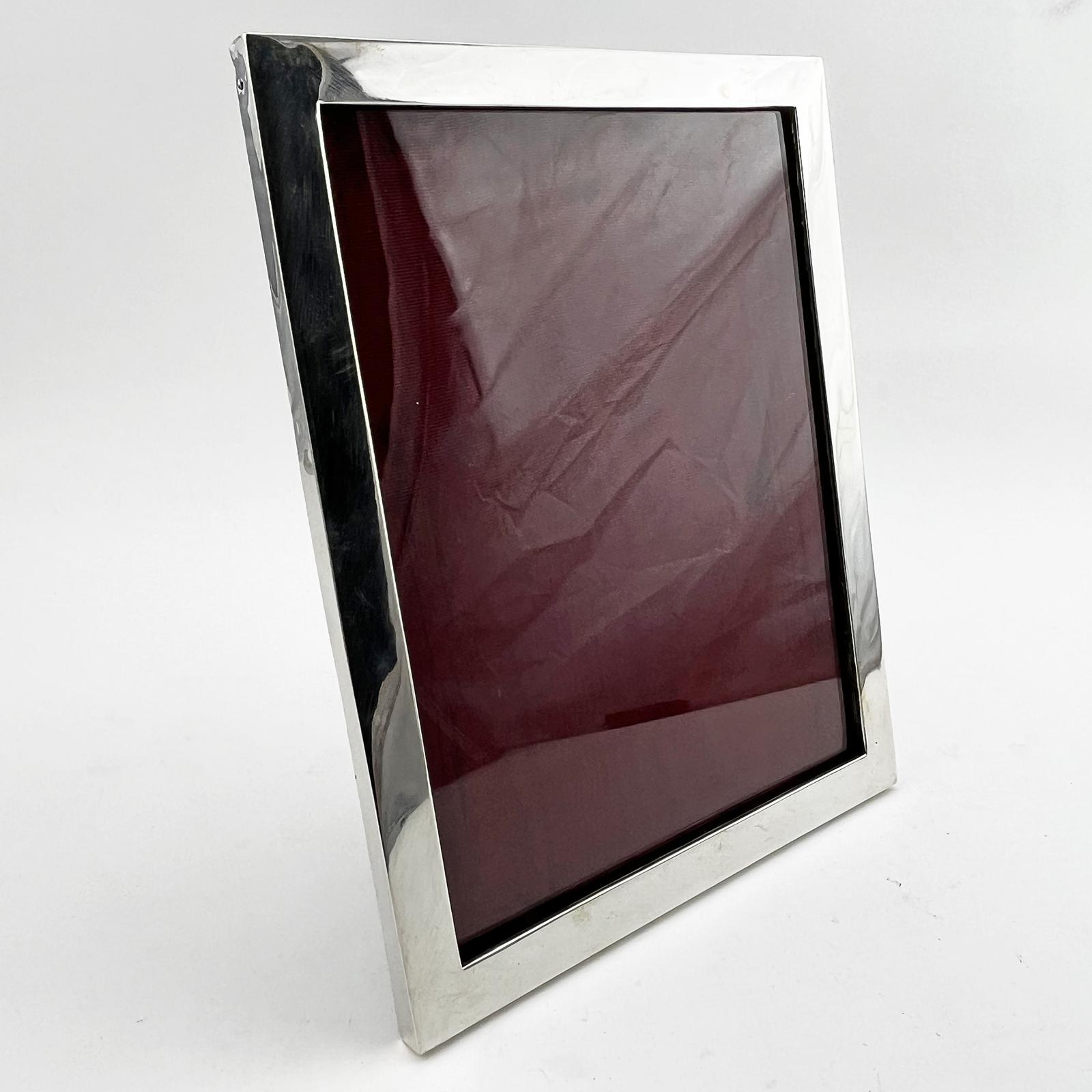 A beautiful sterling silver photo frame in a rectangular form with a plain silver border. The easel back is in black ebonised wood and in very good original condition.