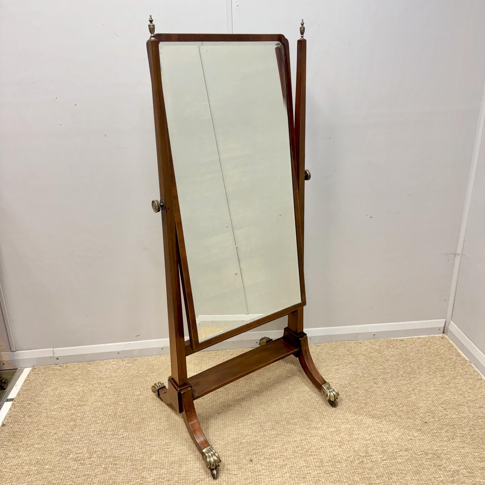 Super quality and very elegant English Regency period mahogany inlaid adjustable cheval mirror, standing on its original solid brass lions paw feet, circa 1820 and with fabulous original bevelled mercury mirror plate too.