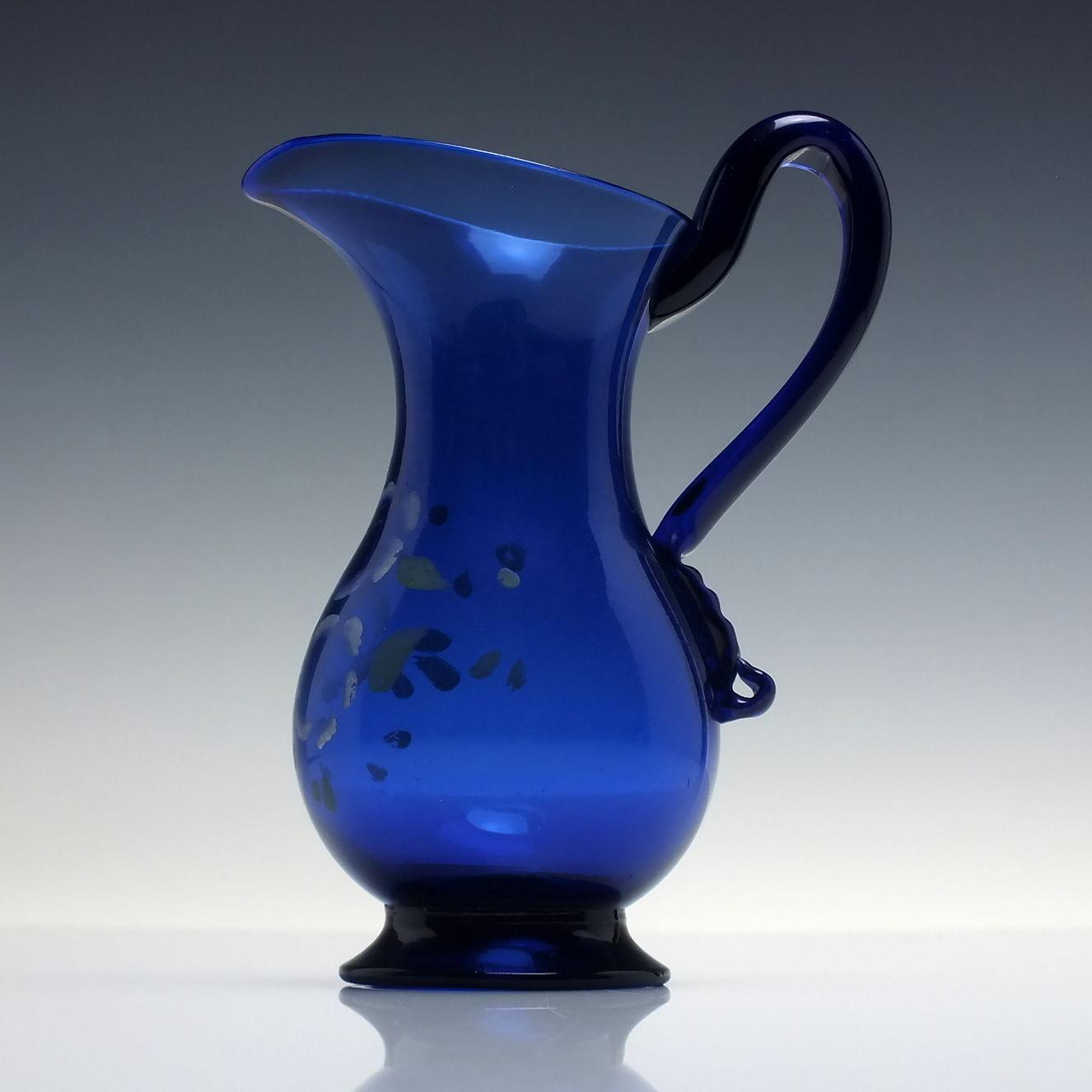 An early 19th Century Bristol blue glass cream jug dating between c1800 and c1830. It has a baluster-form body with a swan lip and an applied ‘scroll kick’ handle with a pinched terminal, decorated with white enamel flowers and light green leaves. Rough pontil to the footed base.