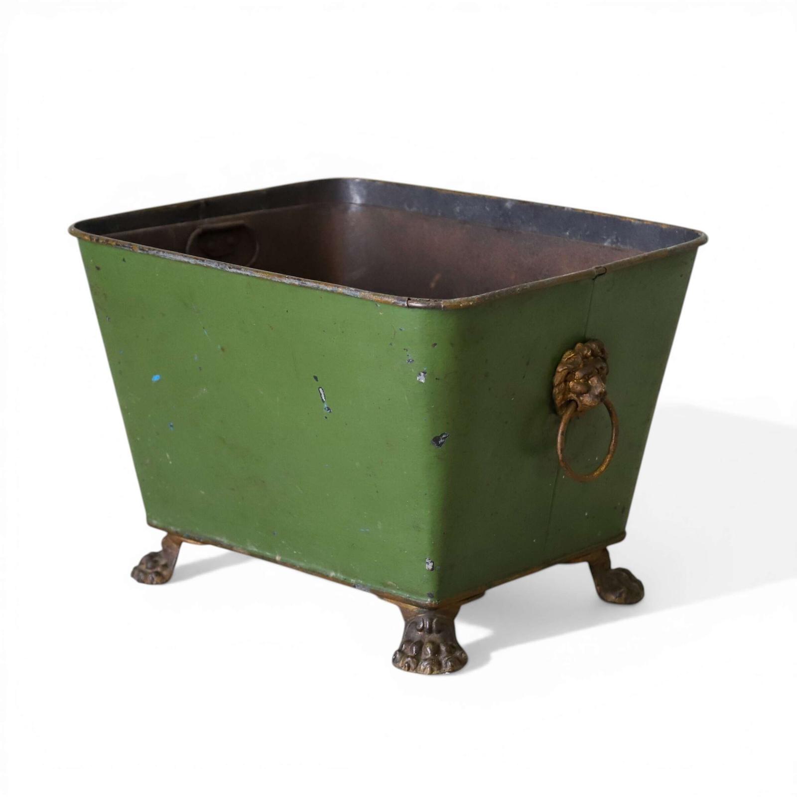 A diminutive and charming early‑19th‑century Regency log basket with worn green paint, lion mask handles, and its original liner - versatile as a log holder, wine cooler, or decorative accent