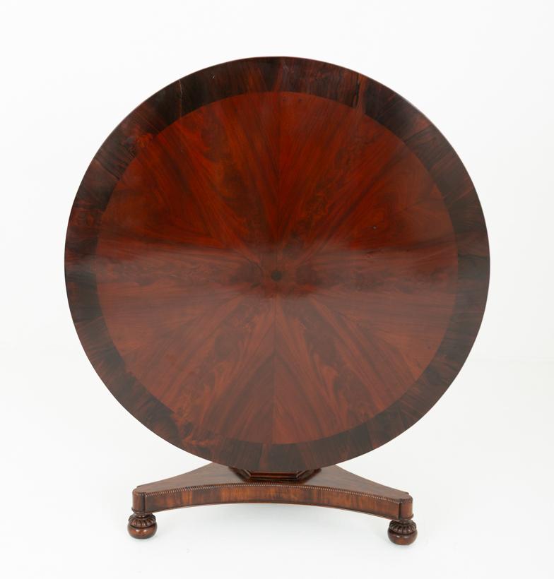 Early 19th Century Regency antique mahogany circular centre table. The top of the table features segmented timbers and rosewood cross banding and tilts by way of a brass catch for ease of storage. The triform base of the table having turned and carved feet and turned mouldings.