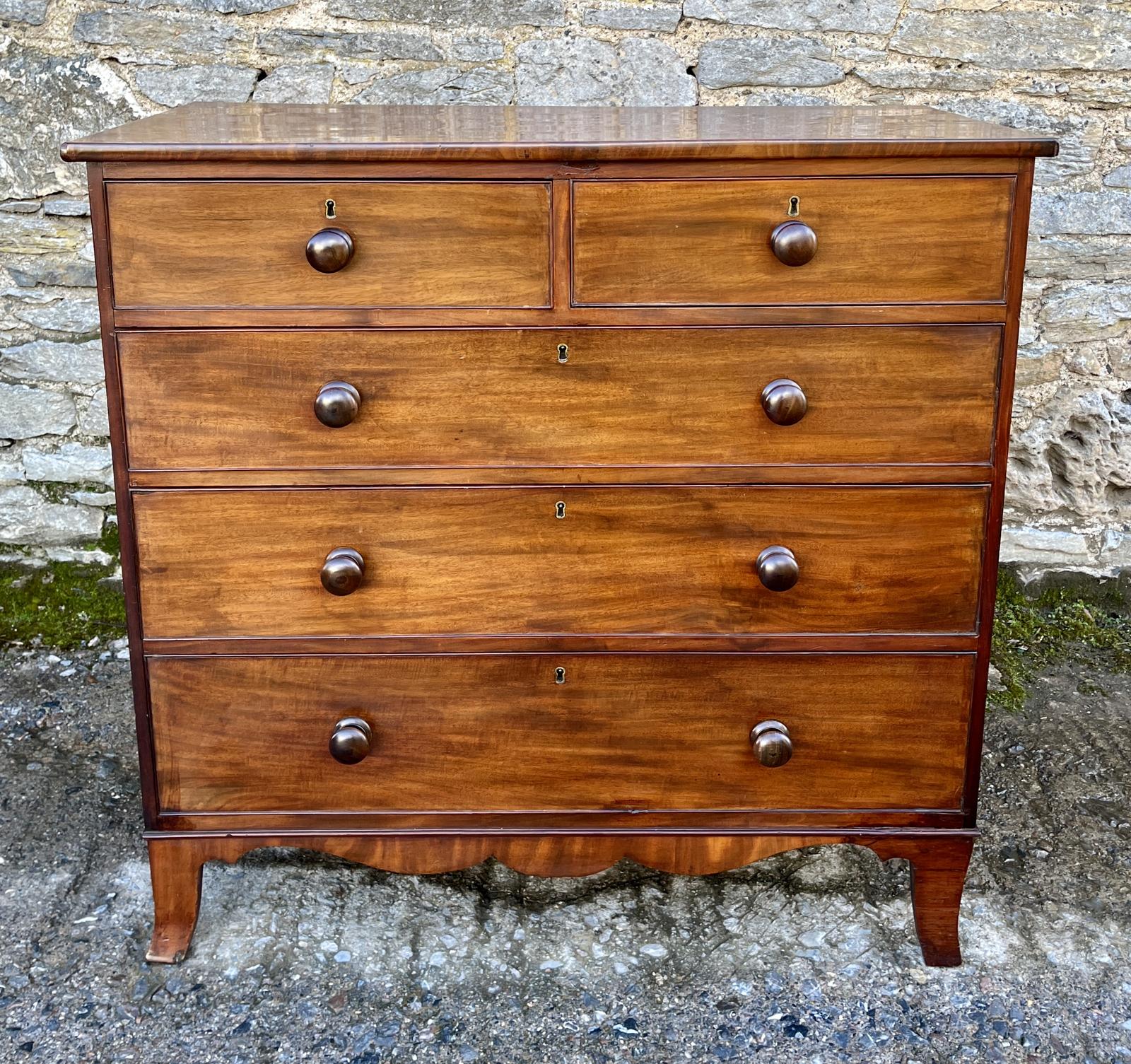 A lovely mahogany chest of drawers dating from the early 19th Century. There are two short over three long drawers, each with the original turned knobs and blue penny paper linings. The chest stands on bracket feet with a shaped apron.