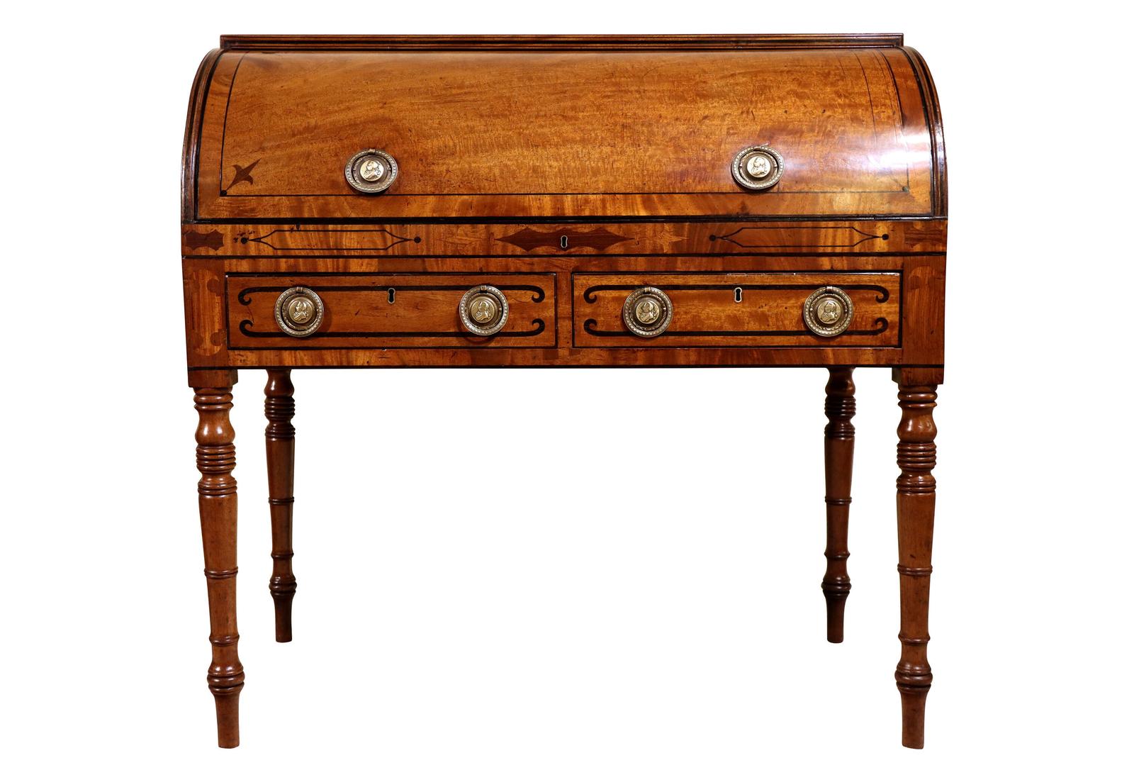 Regency Mahogany Cylinder Desk with Ebony Inlay & Brass Ring Handles, c.1820