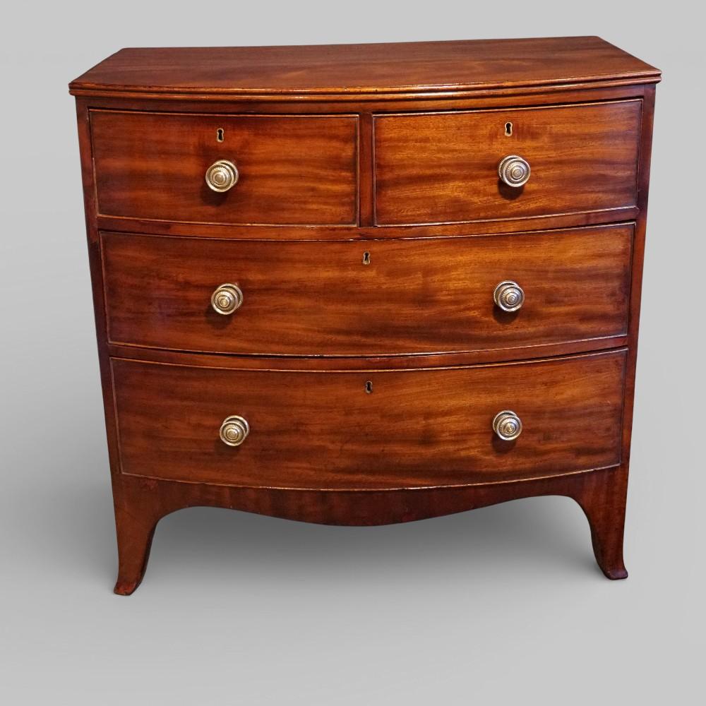 • Regency mahogany small bow front chest of drawers carries the Hingstons Antiques product guarantee plate which gives you the peace of mind that any item with this plate, is of the quality and condition expected when purchasing from Hingstons Antiques Limited. All our goods are individually selected by Nick Hingston who uses his experience of over 45 years of trading to select the items with the best design and condition suitable to be placed into our quality stock.