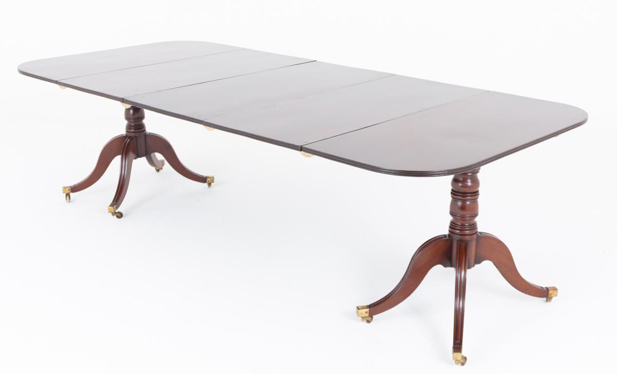 A fine Regency-period mahogany twin pedestal dining table raised upon two elegant pedestals. Each pedestal stands on four gracefully shaped legs fitted with original box castors and supports a ring-turned central column.