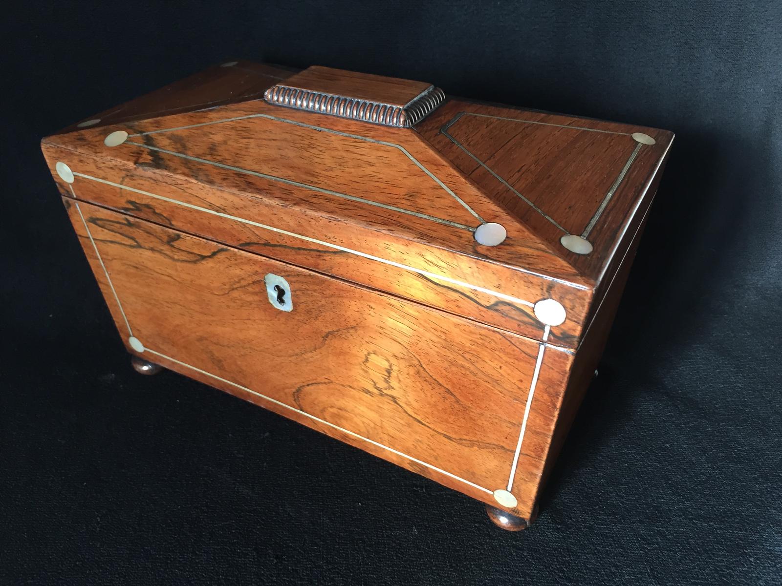 Regency Period Tea Caddy in a Sarcophagus Form Decorated with Mother of Pearl Inlay