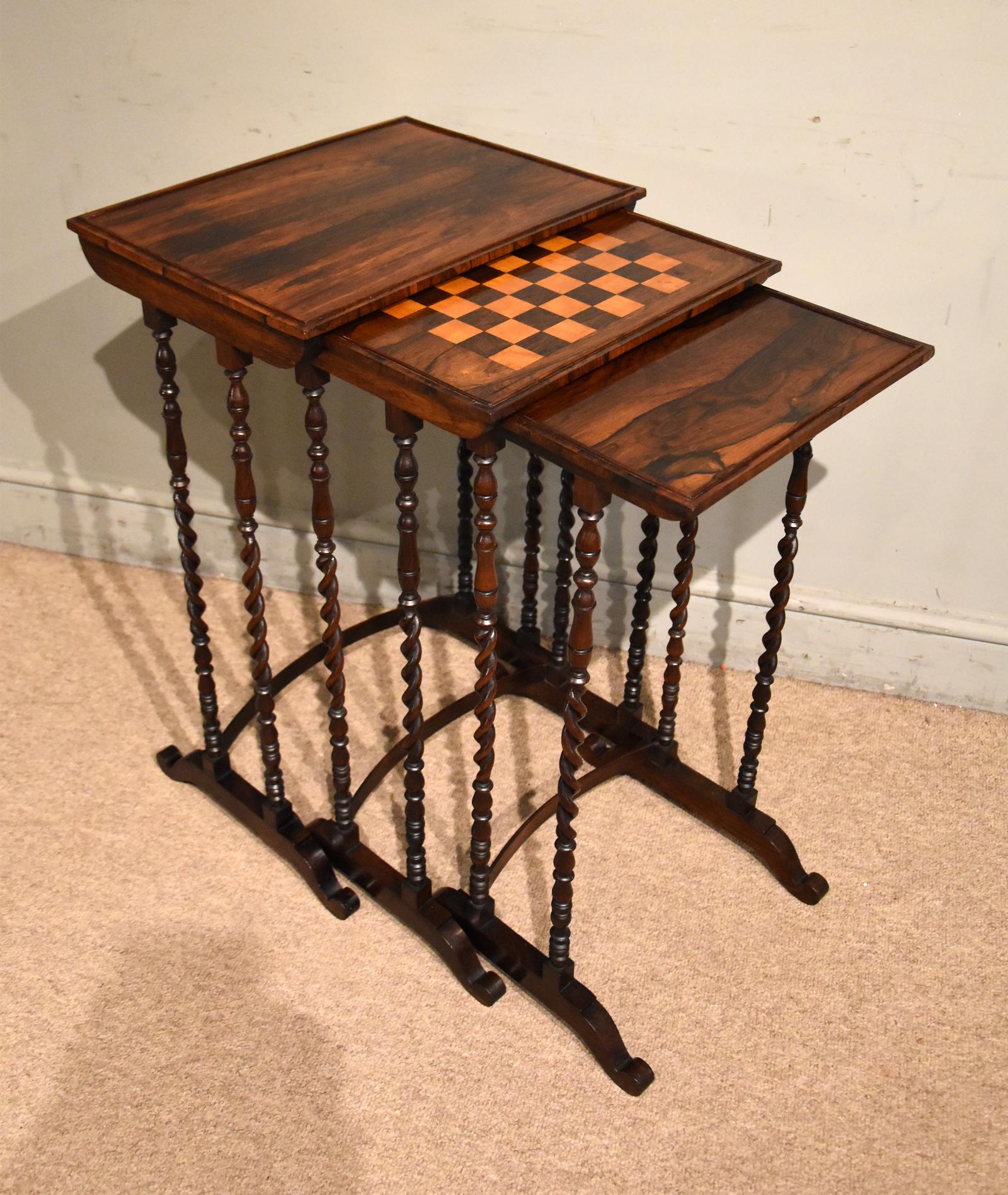 An attractive nest of three Regency period occasional tables in rosewood with a games table raised on unusual superbly turned barley twist supports of stunning rich colour.