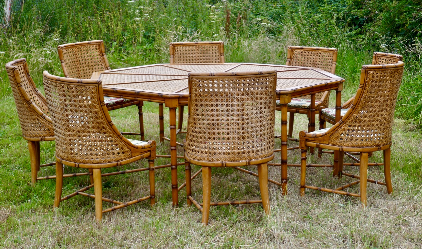 Regency Style Simulated Bamboo and Bergèr Set of 8 Chairs & Octagonal Table
