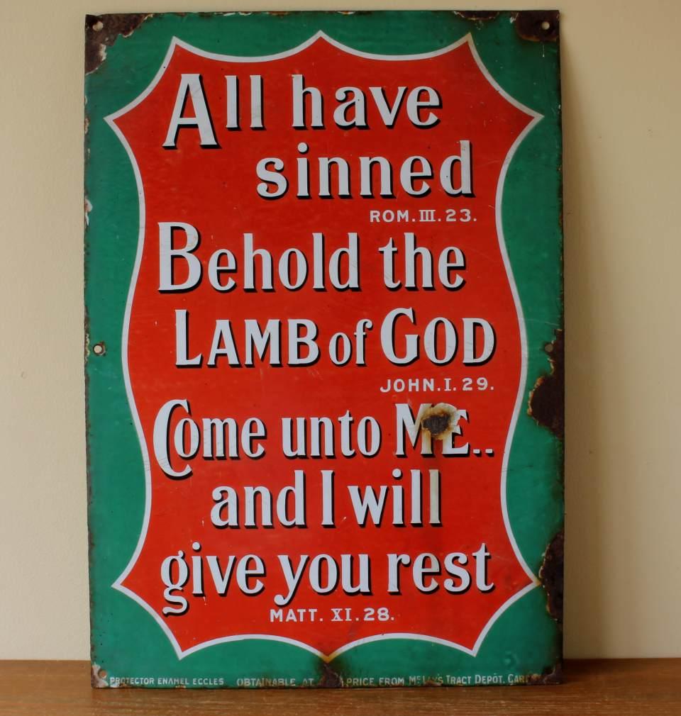 Religious Church Enamel Metal Sign. Lamb Of God Bible Quote. C1915