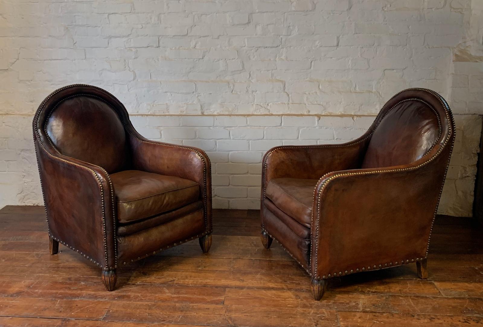 Remarkable & Very Rare Pair of Original French Leather Club Chairs c.1930