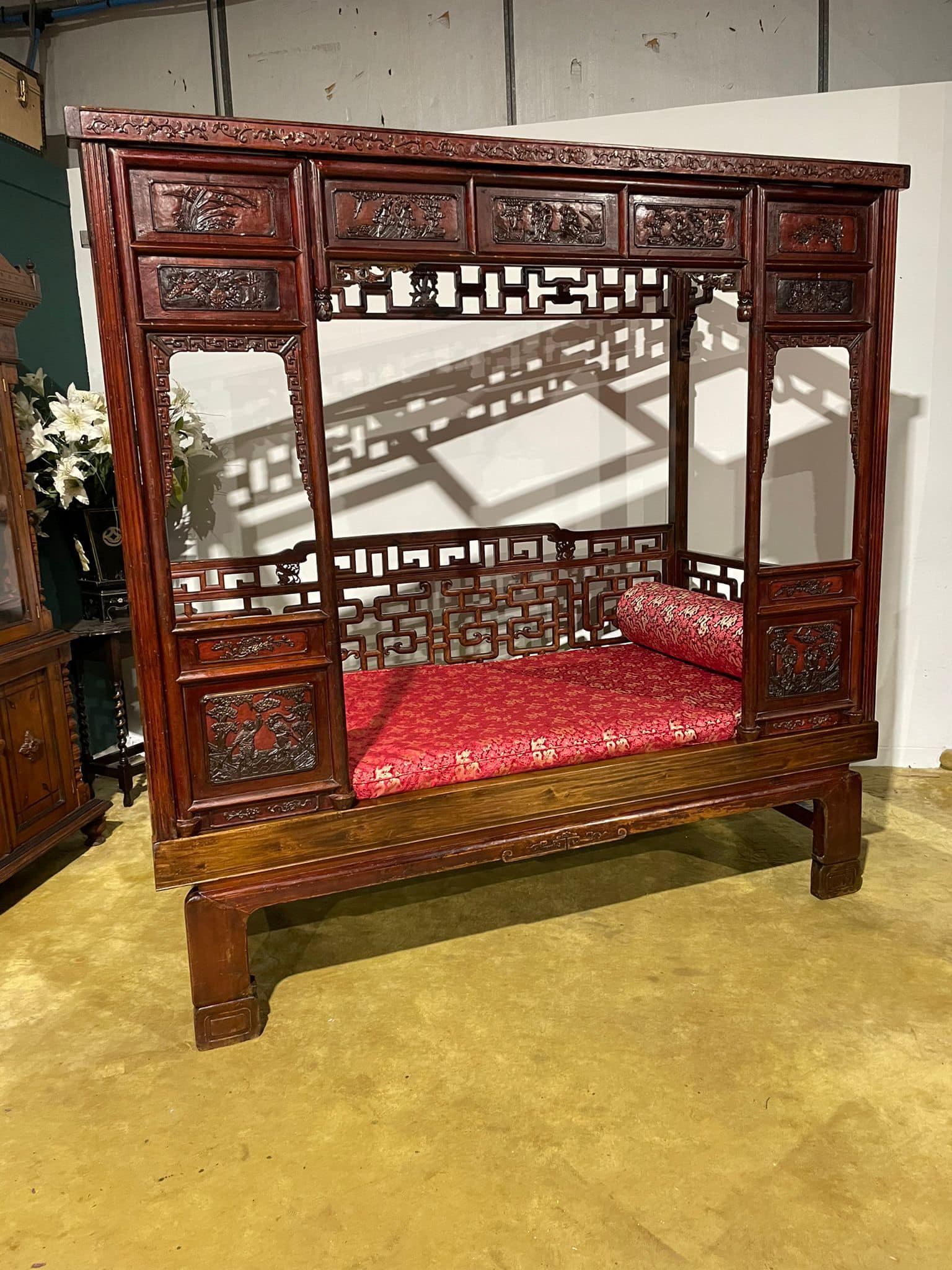 Reproduction Oriental Mahogany Framed Opium Bed with Carved Panels (1 of 14)