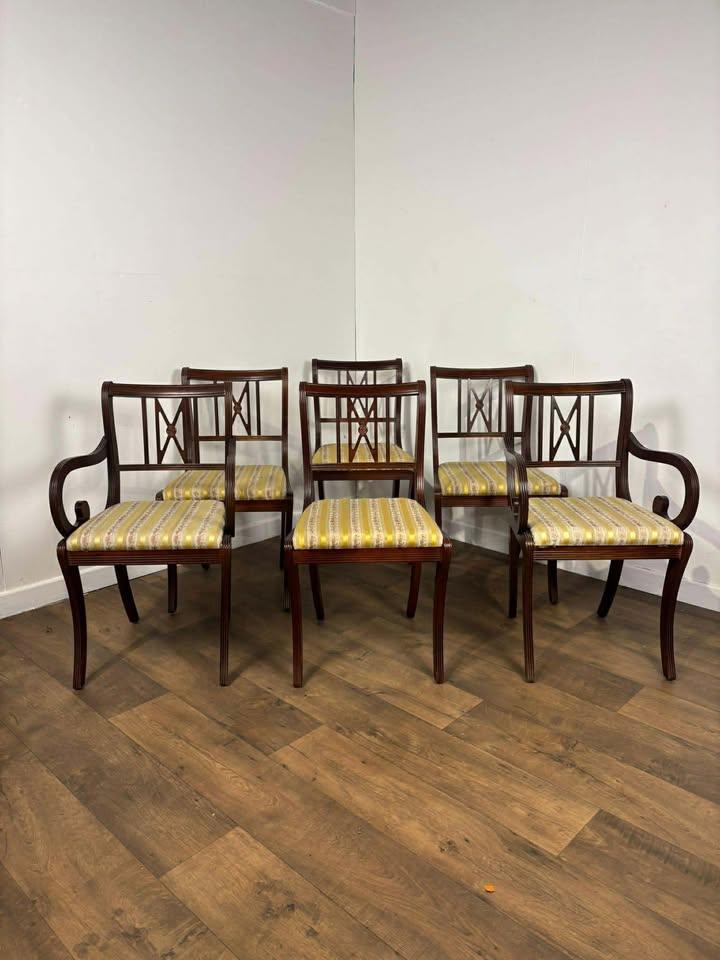 A charming and well-made set of six Regency style dining chairs, crafted in rich-toned mahogany and offering classic period-inspired elegance.