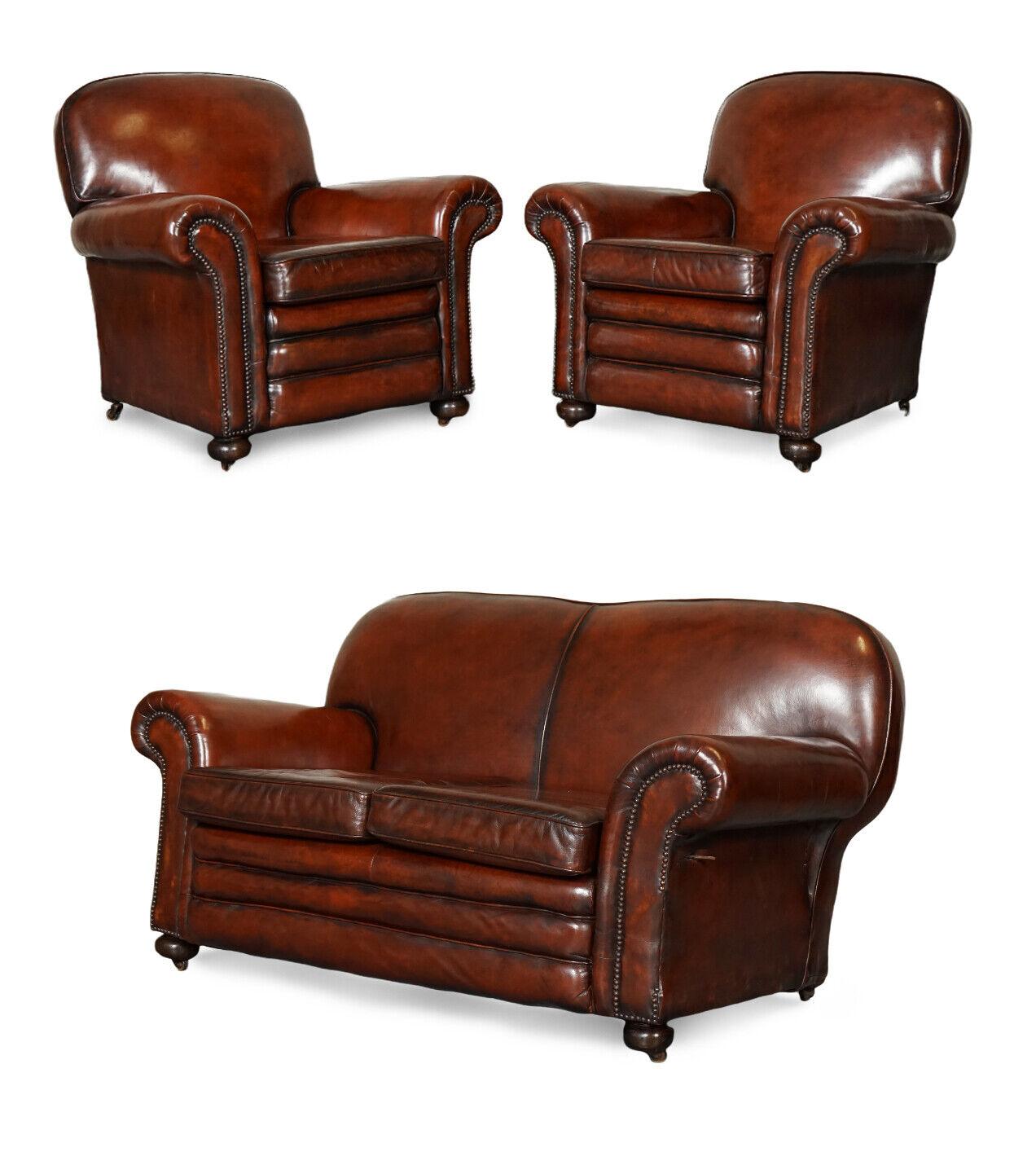 Restored Victorian Style Maroon Dyed Leather Suite Club Armchairs Gentleman Club Sofa