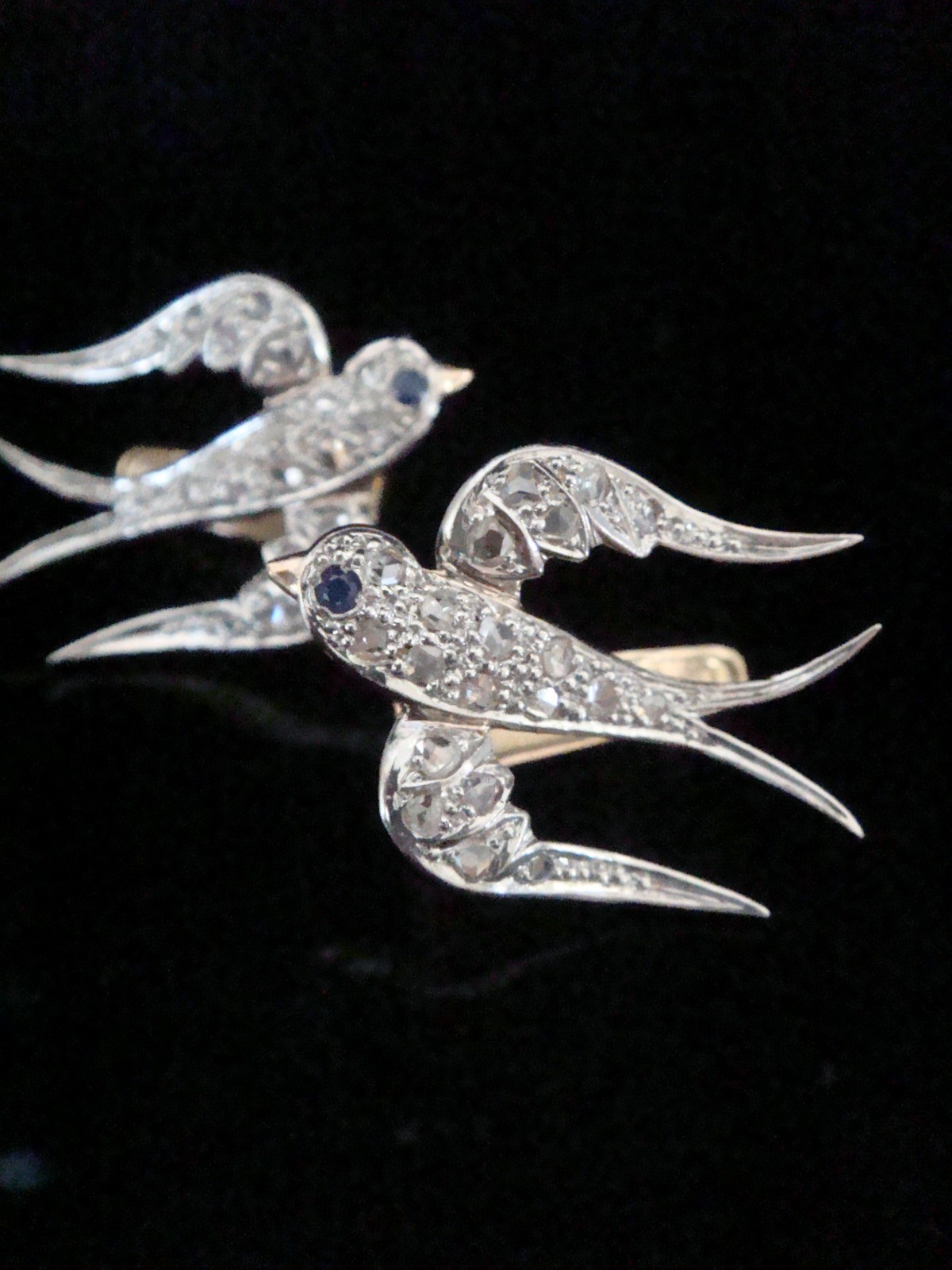 Retro French Minimum 14ct Yellow Gold Rose Cut Diamond Sapphire Swallow Earrings