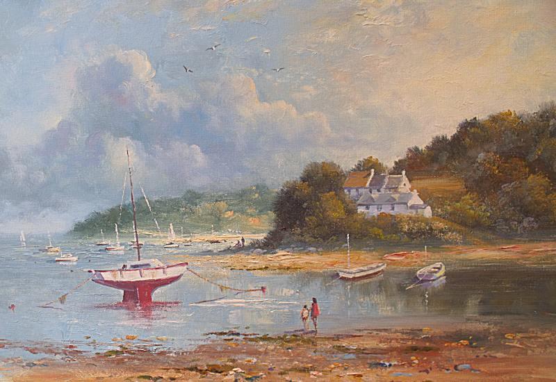 Richard Blowey Original Oil Painting - Coastal Scene with Boats