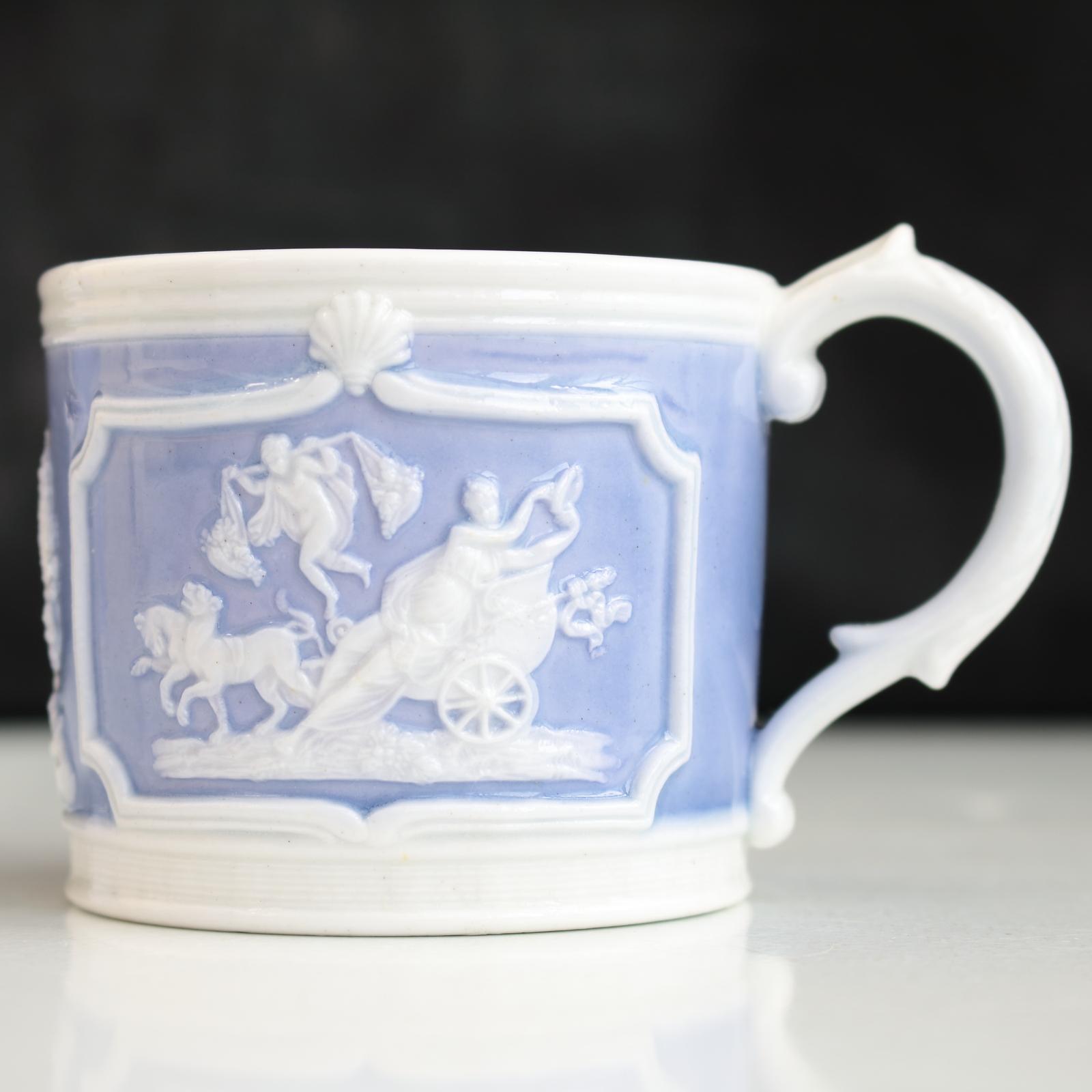 Wonderful early 19th century mug with white sprigged classical framed scenes featuring chariots, cherubs and others, all against a beautiful lilac background, made in England in the early 1800s by Job Ridgway & Sons